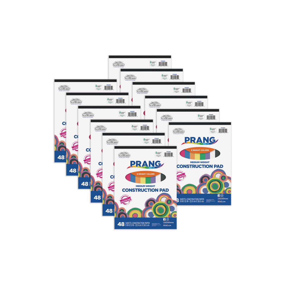 Prang® Medium Weight Groundwood Construction Paper Pad features 8 assorted colors: Scarlet, Orange, Blue, Violet, Green, Yellow, Black, and White. It is perfect for beginner arts & crafts. Great for both home and school use and is portable. Recyclable. Measures 9" x 12". Each pad includes 48 sheets. Sold as a pack of 12.