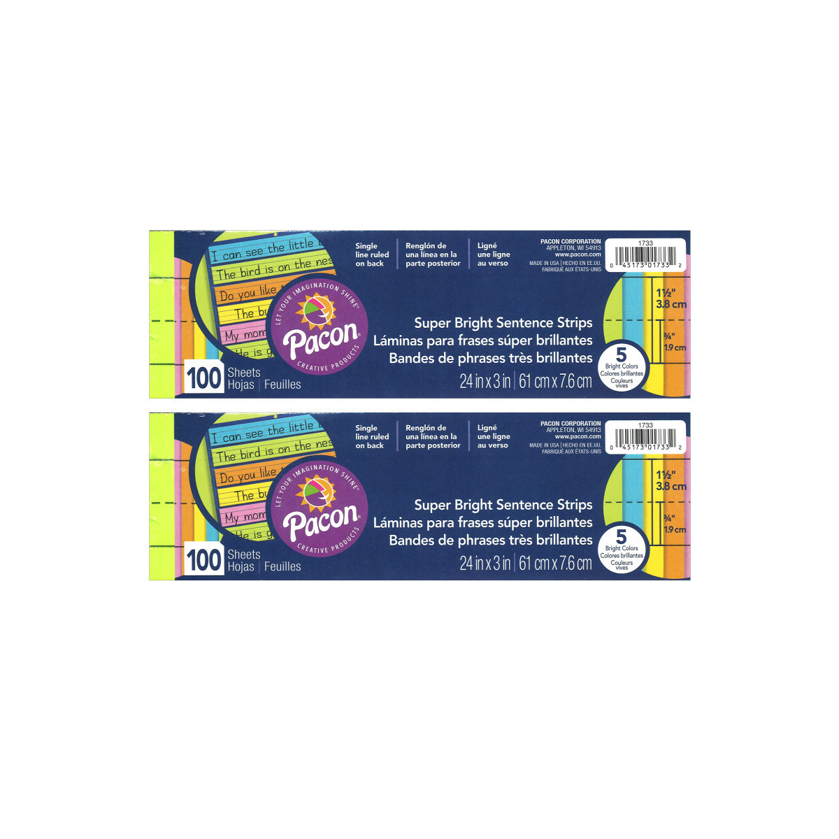 Sturdy tagboard stock has a 1-1/2" ruling with 3/4" dotted midline on one side and a single line ruled on the opposite side. These strips measure 3" x 24". Assorted colors include: Hot Orange, Hot Blue, Hot Lime, Hot Pink and Hot Yellow. Recyclable. Each film-wrapped pack includes 100 sentence strips. Sold as 2 packs for a total of 200 strips.