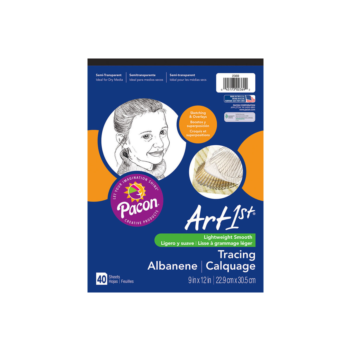 Standard grade transparent paper in pad format that can be used for sketches and overlays. Good transparent qualities and it will accept pencil, marker, and ink. Acid free and recyclable. Each pad includes 40 sheets. Measures 9" x 12".