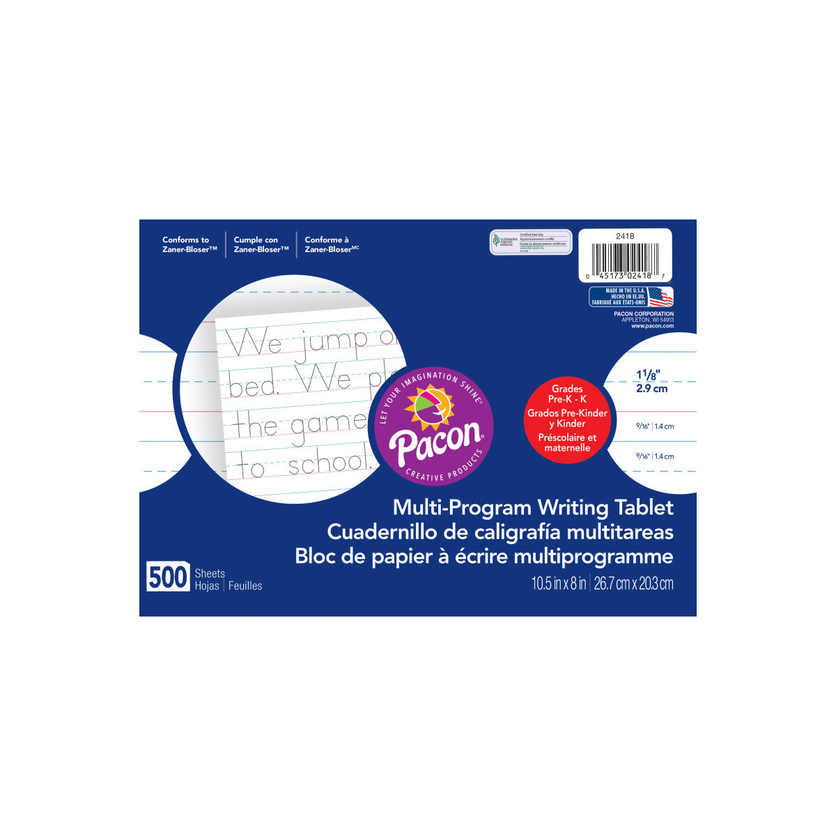 Our Pacon® Multi-Program Handwriting Papers offer rulings that conform to the Zaner-Bloser™ (Grade Pre-K and K) handwriting program. Bright tablet paper ruled both sides with red baselines, blue dotted midlines and blue headlines. Reams are film wrapped with a full page, four color, retail-friendly top sheet. Recyclable. Ruling: 1-1/8" (long way). Dotted Midline: 9/16". Skip Space: 9/16". Includes 500 sheets. Measures 10.5" x 8".