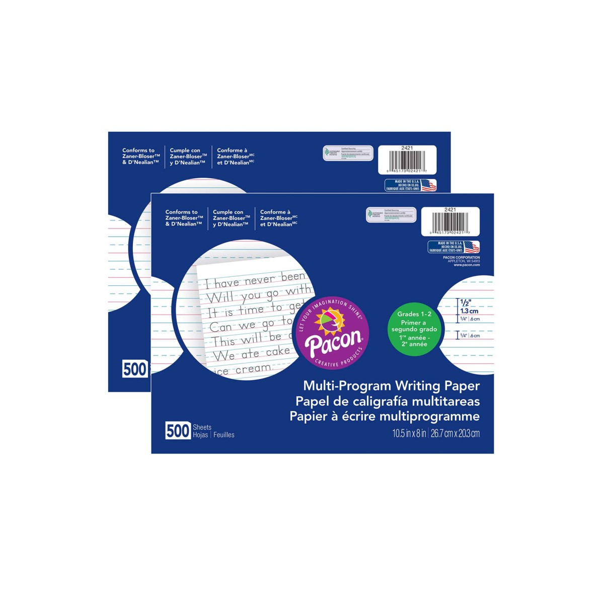 Our Pacon® Multi-Program Handwriting Papers offer rulings that conform to both the Zaner-Bloser™ (Grade 2) and D'Nealian™ (Grade 1) handwriting programs. Bright tablet paper ruled both sides with red baselines, blue dotted midlines and blue headlines. Reams are film wrapped with a full page, four color, retail-friendly top sheet. Recyclable. Ruled: 1/2" (long way). Dotted Midline: 1/4". Skip Space: 1/4". Each pack includes 500 sheets. Measures 10 1/2" x 8". Sold as 2 packs for a total of 1000 sheets.