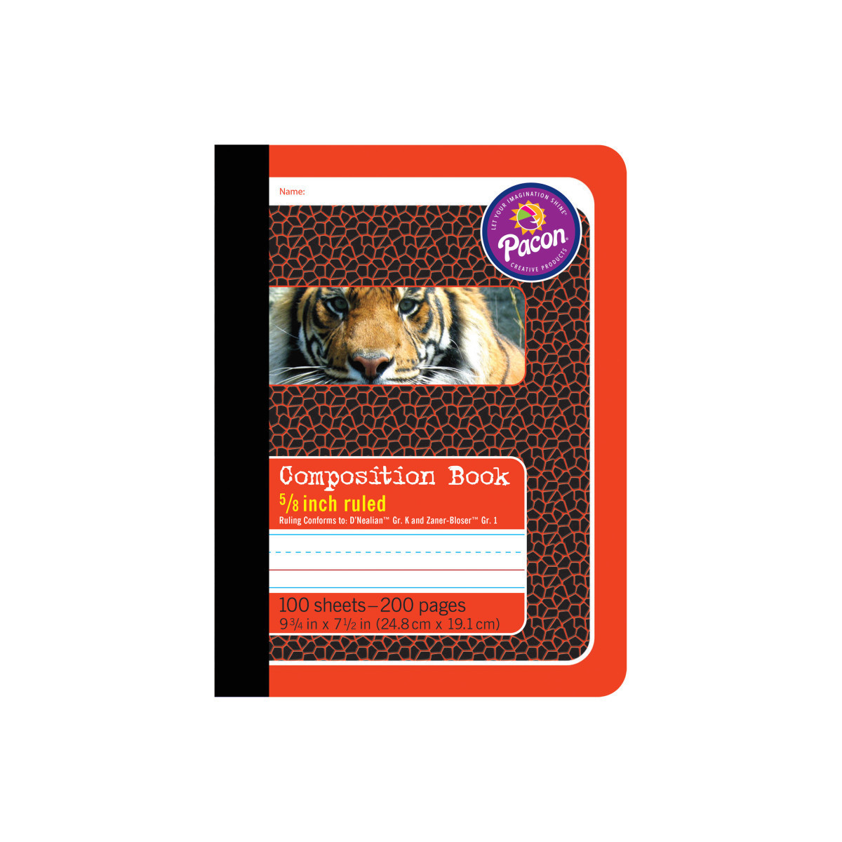 These books help track students' handwriting progress and is perfect for interactive note taking. Comes with a Red colored cover with a tiger printed on the front for easy color coding and identification, and the inside front cover is printed with the alphabet for reference. 5/8" ruling with 5/16" dotted midline and 5/16" skip space conforms to D'Nealian™ Grade K and Zaner-Bloser™ Grade 1 handwriting programs. Each book contains 100 sheets or 200 pages. Recyclable.