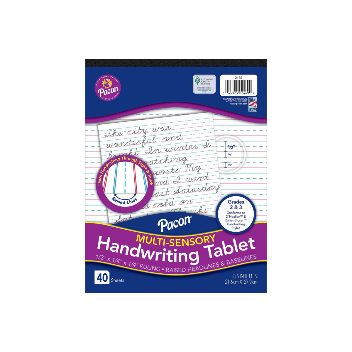 The Multi-Sensory Raised Ruled Tablet has raised headlines and baselines which help students stay within the guidelines. It helps teach handwriting through two senses: sight and touch. This portrait-oriented tablet mimics a standard notebook, making it a great option for students who benefit from the raised ruling, but may not want to draw attention to their learning difference. The headlines are blue and the baselines are red. It has a 1/2" ruling, 1/4" dotted midline and 1/4" skip space, and conforms to both D'Nealian™ and Zaner-Bloser™ handwriting styles. Tablet measures 8-1/2" x 11" and includes 40 sheets.