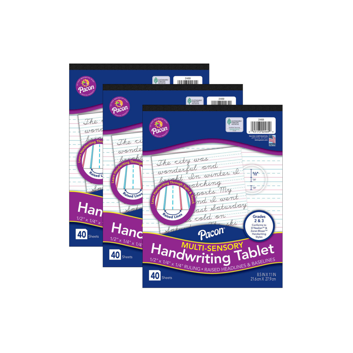 The Multi-Sensory Raised Ruled Tablet has raised headlines and baselines which help students stay within the guidelines. It helps teach handwriting through two senses: sight and touch. This portrait-oriented tablet mimics a standard notebook, making it a great option for students who benefit from the raised ruling, but may not want to draw attention to their learning difference. The headlines are blue and the baselines are red. It has a 1/2" ruling, 1/4" dotted midline and 1/4" skip space, and conforms to both D'Nealian™ and Zaner-Bloser™ handwriting styles. Tablet measures 8-1/2" x 11" and includes 40 sheets. Sold as a pack of 3 tablets.
