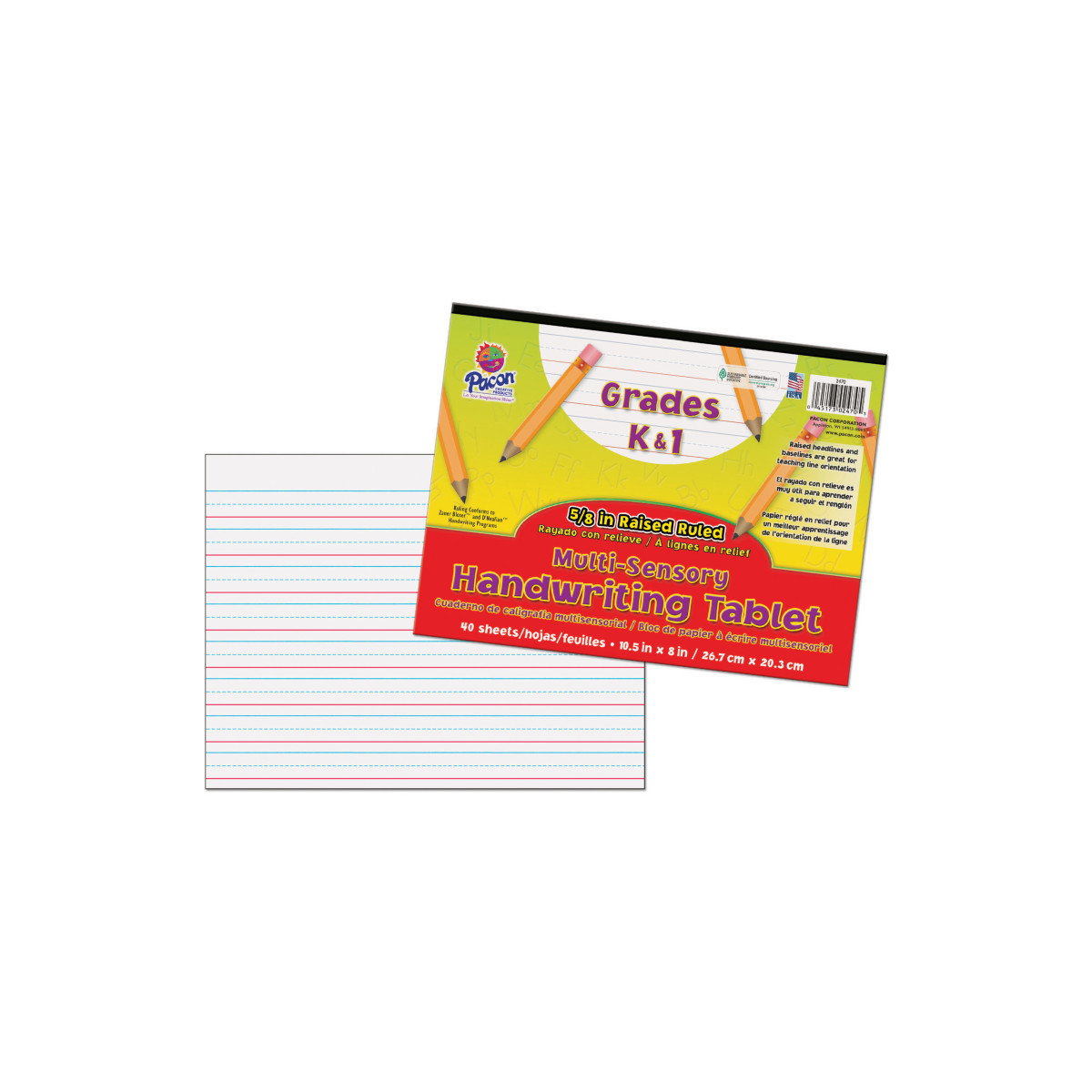 The Multi-Sensory Raised Ruled Paper has raised headlines and baselines which help students stay within the guidelines. It helps teach handwriting through two senses, sight and touch. The headlines are blue and the baselines are red. It has a 5/8" ruling, 5/16" dotted midline and 5/16" skip space and conforms to both D'Nealian® and Zaner-Bloser™ handwriting styles. Tablets contain 40 sheets with a heavy chipboard back and protective retail-friendly cover. Recommended for Grades K and 1. Measures 10.5" x 8".