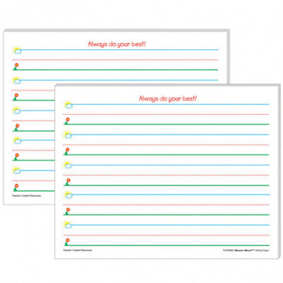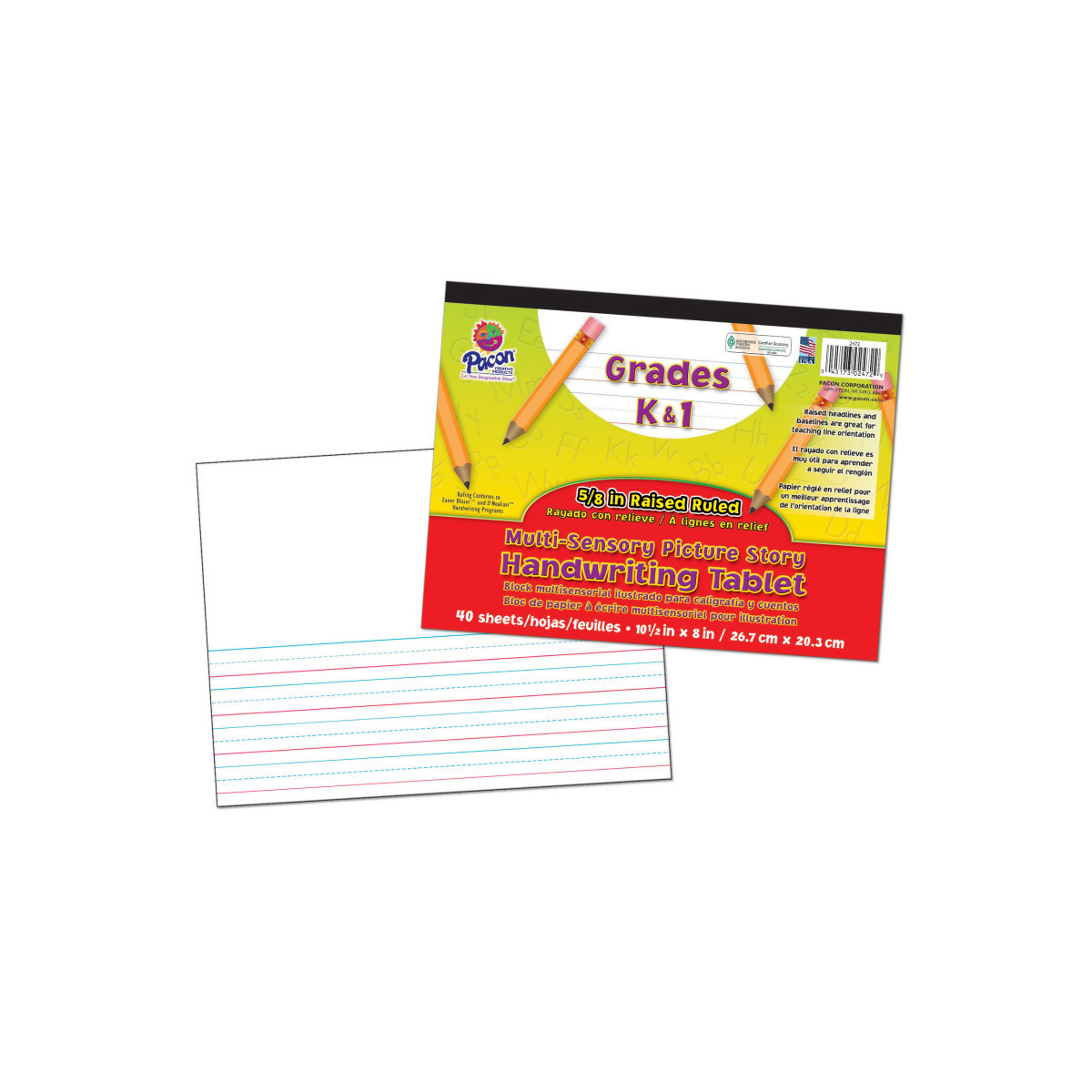 The Multi-Sensory Raised Ruled Paper has raised headlines and baselines which help students stay within the guidelines. It helps teach handwriting through two senses, sight and touch. The headlines are blue and the baselines are red. It has a 5/8" ruling, 5/16" dotted midline and 5/16" skip space and conforms to both D'Nealian® and Zaner-Bloser™ handwriting styles. This tablet has 4-3/8" picture story space at the top and contains 40 sheets of paper. Recommended for Grades K and 1. Measures 10.5" x 8".