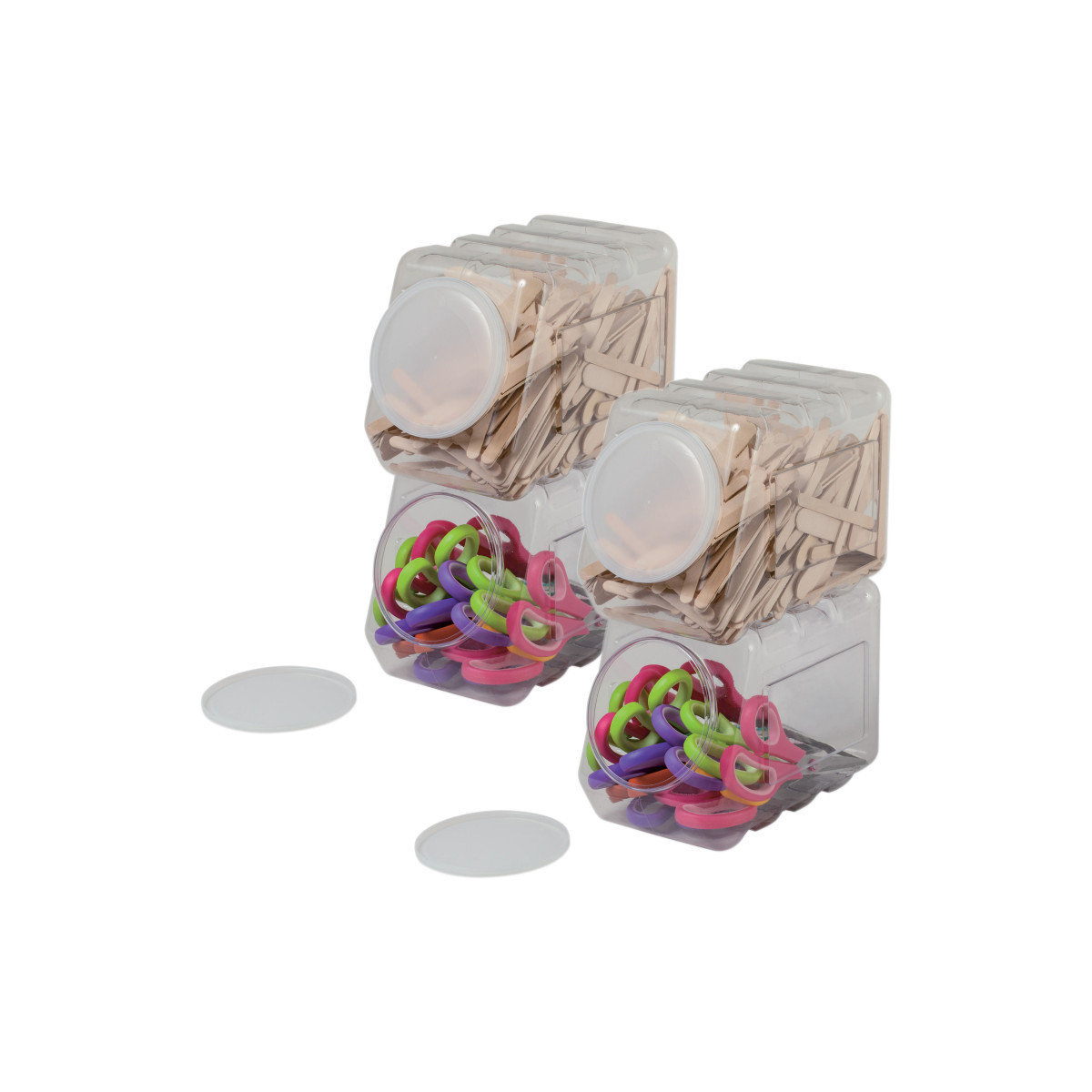 Tough, clear plastic storage bin is wide-mouthed and great for storing supplies. Perfect for scissors, craft items, blocks, manipulatives, etc. Made from high-impact, recyclable plastic, and FDA approved. Measures 5.5" x 6.75". Sold as a pack of 2 storage containers.
