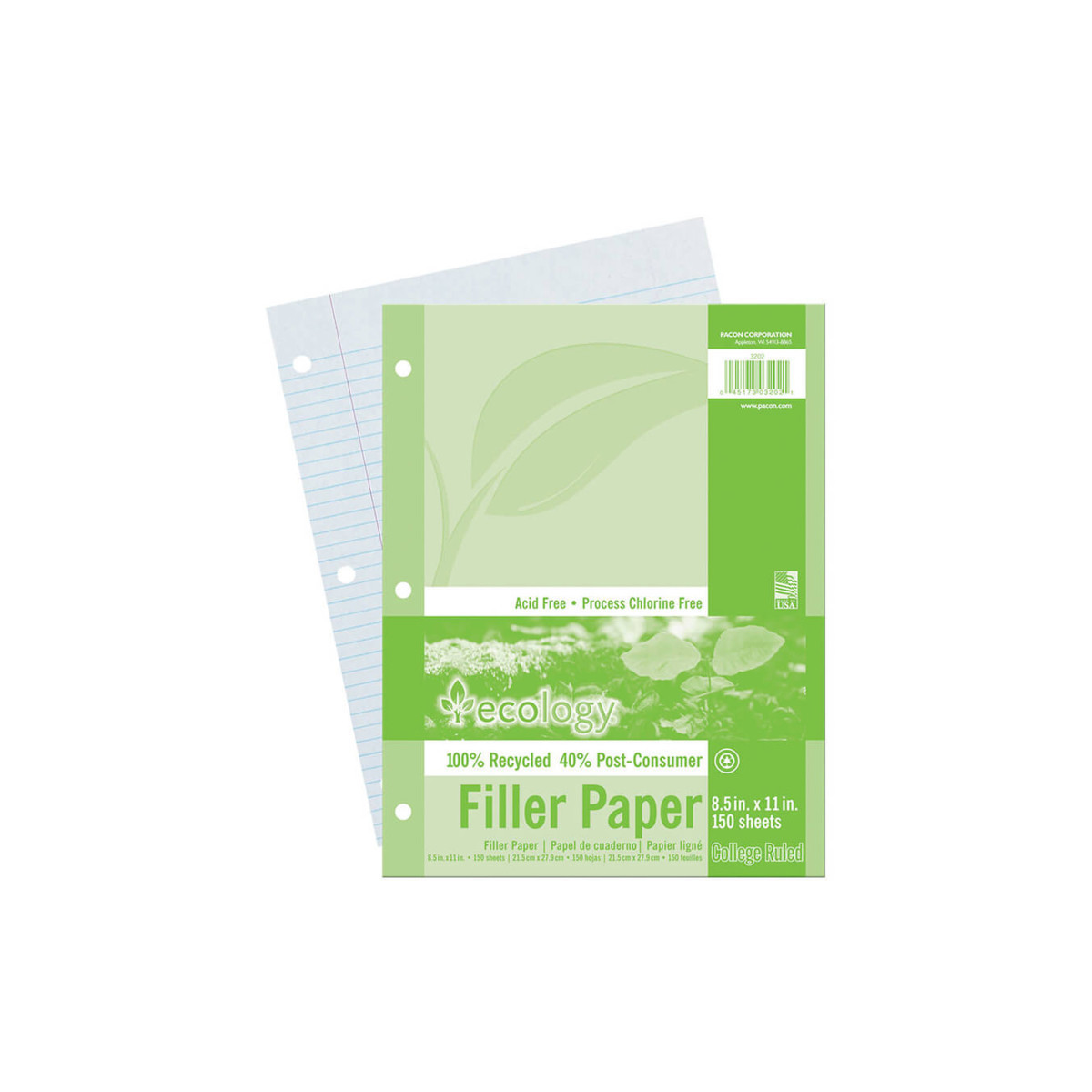 An environmentally friendly filler paper! This recycled filler paper contains 100% recycled content with 40% post-consumer fiber. Each sheet is 3-hole punched, and each package is film wrapped. Acid-free and process chlorine free. Ruling: 9/32" (college ruled). Measures 8.5" x 11". Includes 150 sheets.