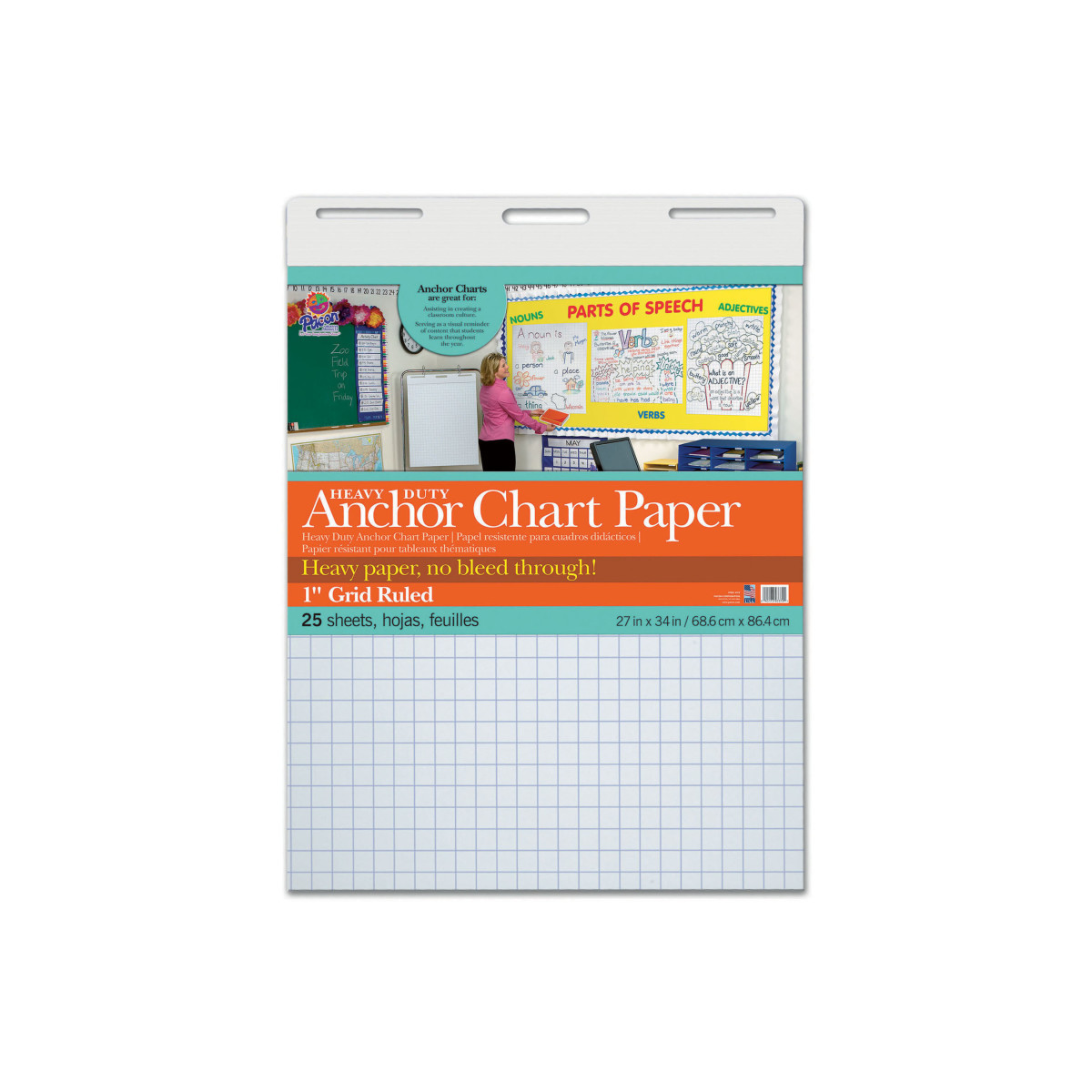 This chart offers heavier paper than a traditional easel pad, perfect for classroom anchor charts. No bleed-through from page to page. It will assist in creating a classroom culture while serving as a visual reminder of strategies, vocabulary and other content that students learn throughout the school year. Charts include a convenient handle for easy transportation, and can also be used on a Pacon® Chart Stand (sold separately). Recyclable. Measures 27" x 34". Includes 25 sheets.