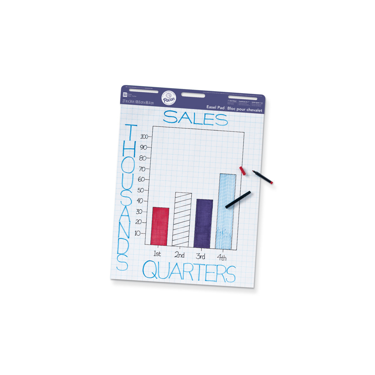 This pad works great for meetings, presentations and classroom anchor charts. This pad contains high quality white sulphite bond paper, 1" grid ruled on one side, and a convenient carrying handle for easy transportation. An extra heavy chipboard back provides a durable writing surface. Measures 27" x 34". Includes 50 sheets.