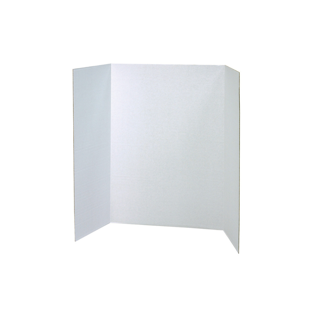 Presentation boards are tri-fold, single-wall corrugated display boards used for projects, booths, science fairs and all types of displays. Boards have a smooth, flat, uniform surface to accept many types of medium. Boards are White on the front and Natural Kraft on the back. The full display size is 48" x 36" and the board folds to 24" x 36". Recyclable.