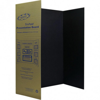 Presentation Boards are tri-fold, single wall corrugated display boards used for projects, booths, science fair presentations and all types of displays. Boards have a smooth, flat, uniform surface to accept many types of medium. Boards are Yellow on the front and Natural Kraft on the back. The full display size is 48" x 36" and the board folds to 24" x 36". Recyclable.