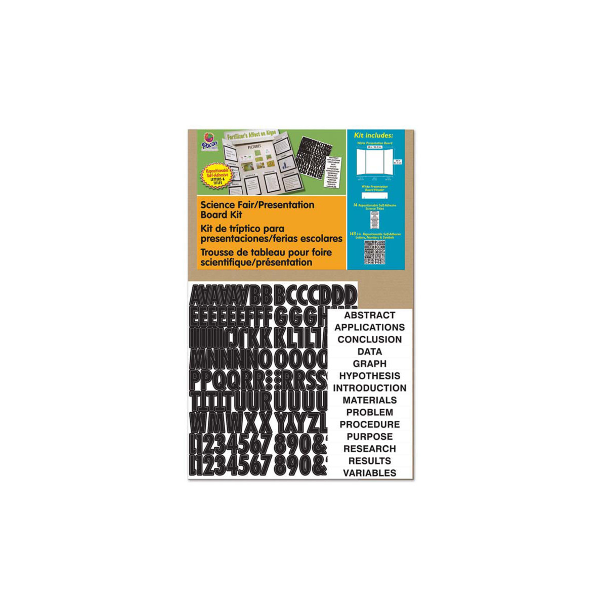 - Kit includes: 48"X36" presentation board, one white 36"X9 1/2" corrugated header, 143 self-adhesive and reusable black letters, numbers and symbols and 14 self-adhesive science titles