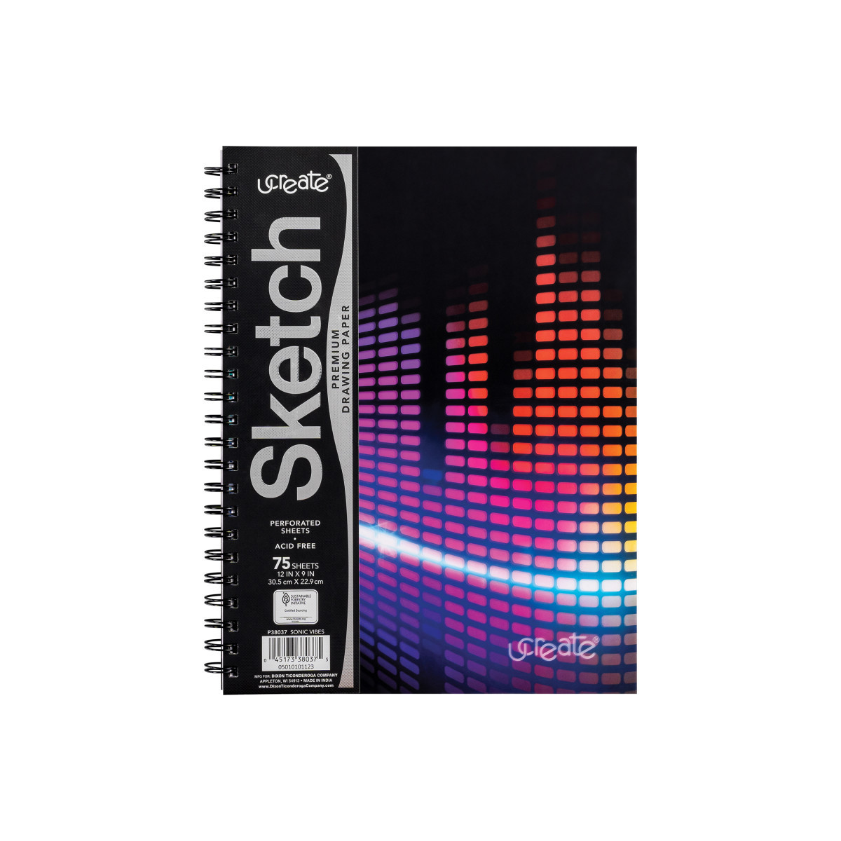 Let your imagination soar with this Sonic Vibes fashion cover sketch book! Premium sketch book with durable front and back poly covers adorned with an on-trend Sonic Vibes design. Each sketch book contains 75 sheets of 120gsm heavyweight, acid-free drawing paper. Measuring 9 x 12 inches, it's easy to take your art and creativity on the go! The spiral binding lies flat for comfortable drawing and sketching. This is the ideal book for sketching and drawing with all types of dry media, such as pencils, colored pencils, pens, and marker art. Sheets are perforated for final art. Perfect school supply for teachers and students.