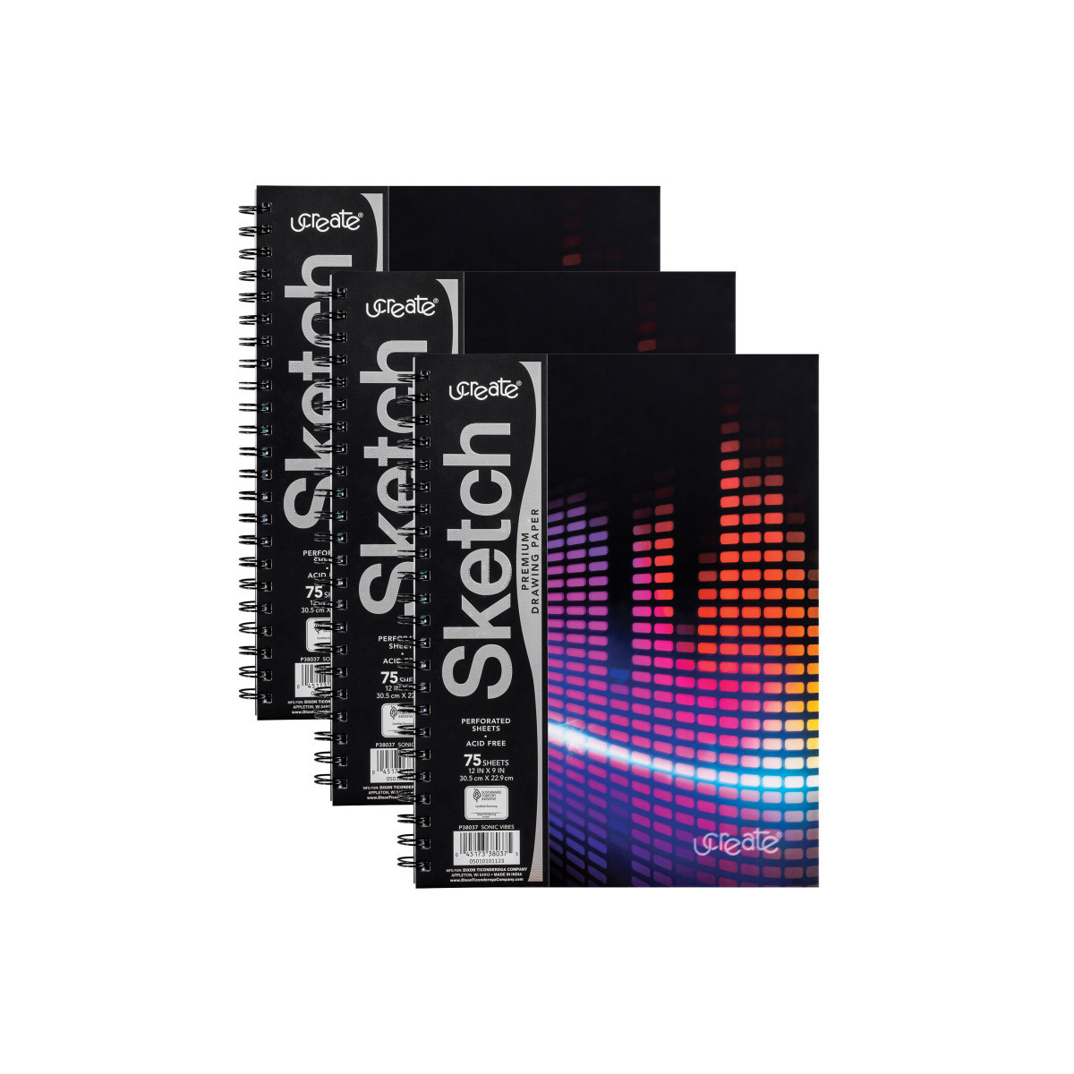 Let your imagination soar with this Sonic Vibes fashion cover sketch book! Premium sketch book with durable front and back poly covers adorned with an on-trend Sonic Vibes design. Each sketch book contains 75 sheets of 120gsm heavyweight, acid-free drawing paper. Measuring 9 x 12 inches, it's easy to take your art and creativity on the go! The spiral binding lies flat for comfortable drawing and sketching. This is the ideal book for sketching and drawing with all types of dry media, such as pencils, colored pencils, pens, and marker art. Sheets are perforated for final art. Perfect school supply for teachers and students. Sold as a pack of 3 books.