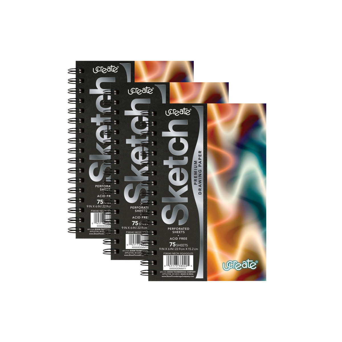Let your imagination soar with this Neon Squiggles fashion cover sketch book! Premium sketch book with durable front and back poly covers adorned with an on-trend Neon Squiggles design. Each sketch book contains 75 sheets of 120gsm heavyweight, acid-free drawing paper. Measuring 9 x 6 inches, it's easy to take your art and creativity on the go! The spiral binding lies flat for comfortable drawing and sketching. This is the ideal book for sketching and drawing with all types of dry media, such as pencils, colored pencils, pens, and marker art. Sheets are perforated for final art. Perfect school supply for teachers and students. Sold as a pack of 3 books.