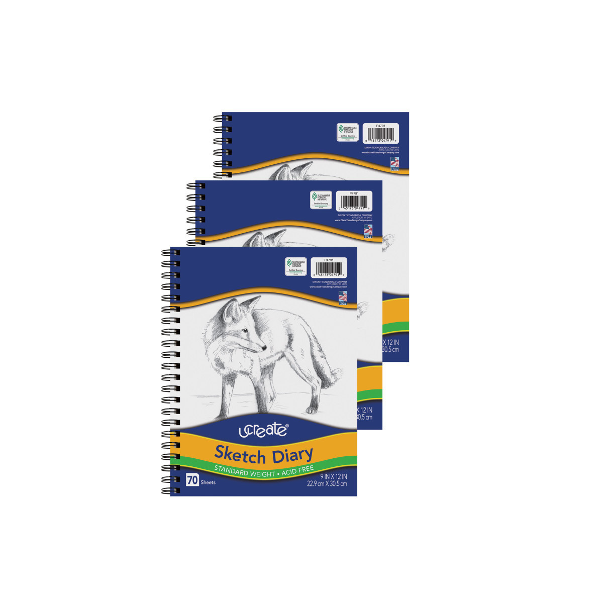 All-purpose lightweight White sulphite drawing paper spiral bound on the side. Perfect for quick study sketches and drawings. Ideal for all dry media. Acid-free and Recyclable. Measures 12" x 9". Includes 70 sheets. Sold as 3 diaries.