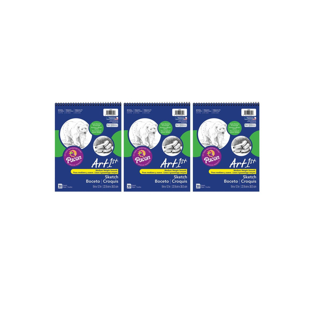 Lightweight White sulphite drawing paper spiral bound at the top. Perfect for classroom and field sketching. A general purpose sketch paper for all dry media. Acid-free and Recyclable. Measures 9" x 12". Each pack includes 30 sheets. Sold as a set of 3 packs, 90 sheets total.
