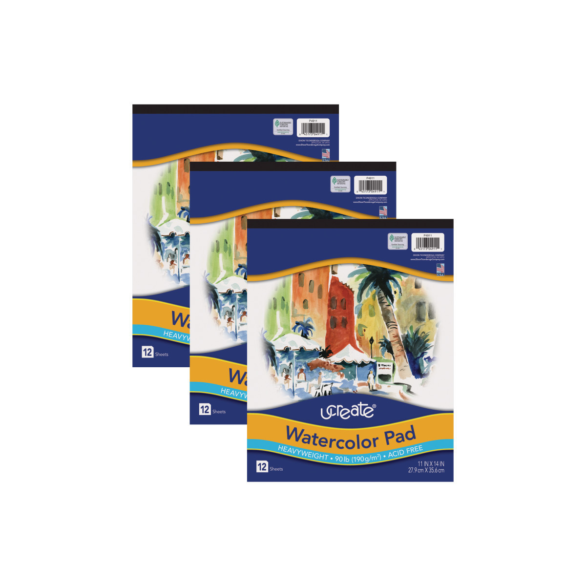 Heavyweight watercolor paper with uniform texture and whiteness. Ideal for wet and mixed-media techniques. Acid-free and Recyclable. Measures 11" x 14". Includes 12 sheets. Sold as a pack of 3 pads.