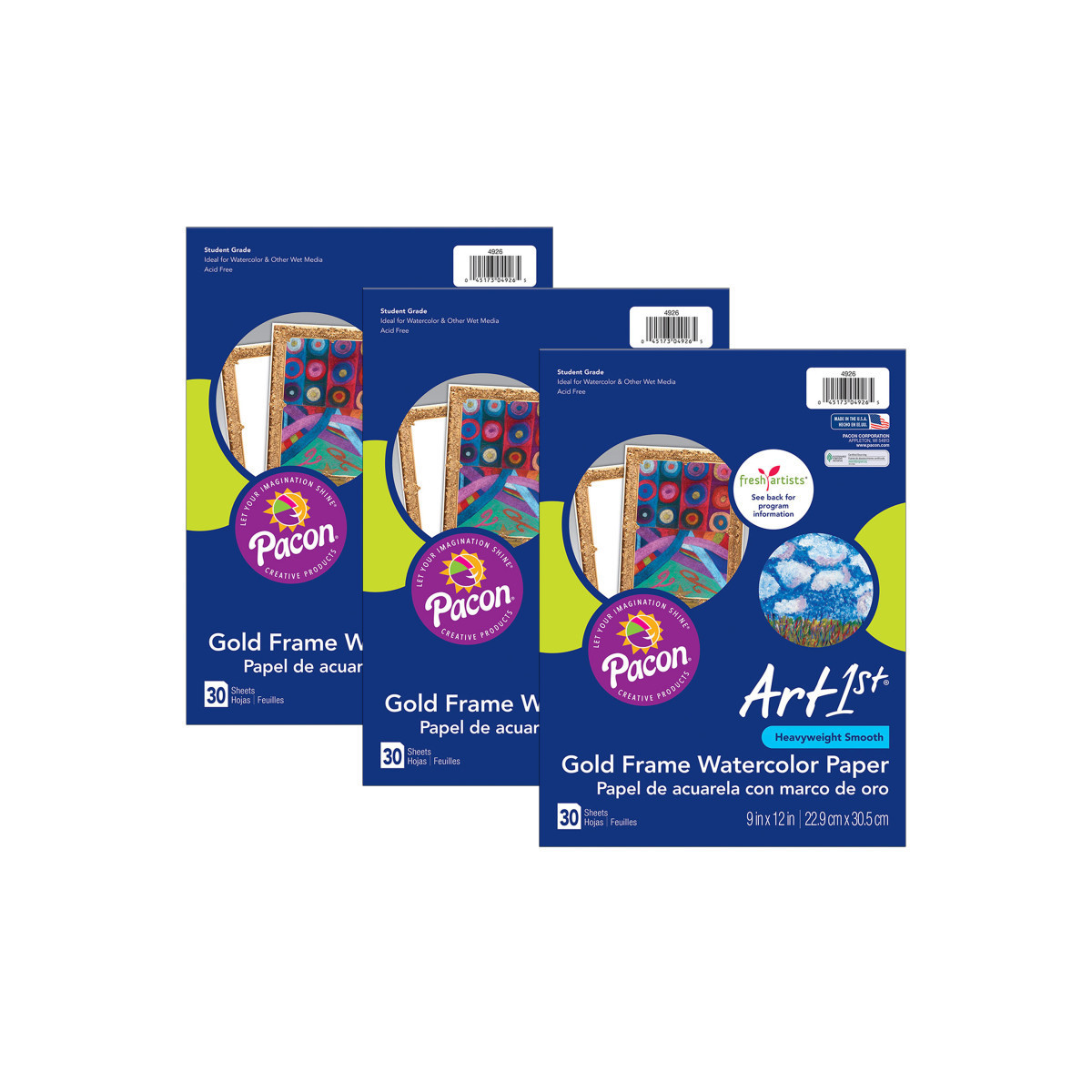 We have created this package of watercolor paper in collaboration with the Fresh Artists® Program. The package contains student grade watercolor paper adorned with a gold frame that will turn any work of art into a finished masterpiece! It's the perfect paper for all ages. Acid free. Recyclable. Measures 9" x 12". Each pack includes 30 sheets. Sold as 3 packs for a total of 90 sheets.