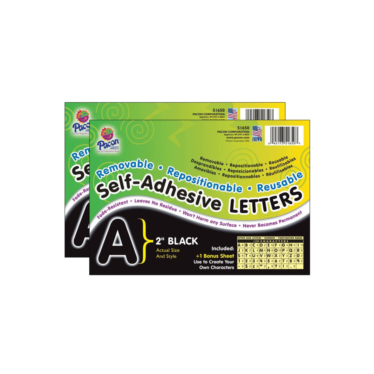 A unique adhesive makes these letters removable, repositionable and reusable. They are easy to use - just "peel and place". They adhere to any clean and dry surface that is smooth or slightly textured (even wood and painted brick walls). Fade-resistant, acid free, leaves no residue and never becomes permanent. Each package contains uppercase letters along with numbers and punctuation marks. Ideal for bulletin boards, signs, posters, presentation boards and much more. The 2" letters have 159 characters per pack. Sold as a set of 2 complete packs, 318 characters total.