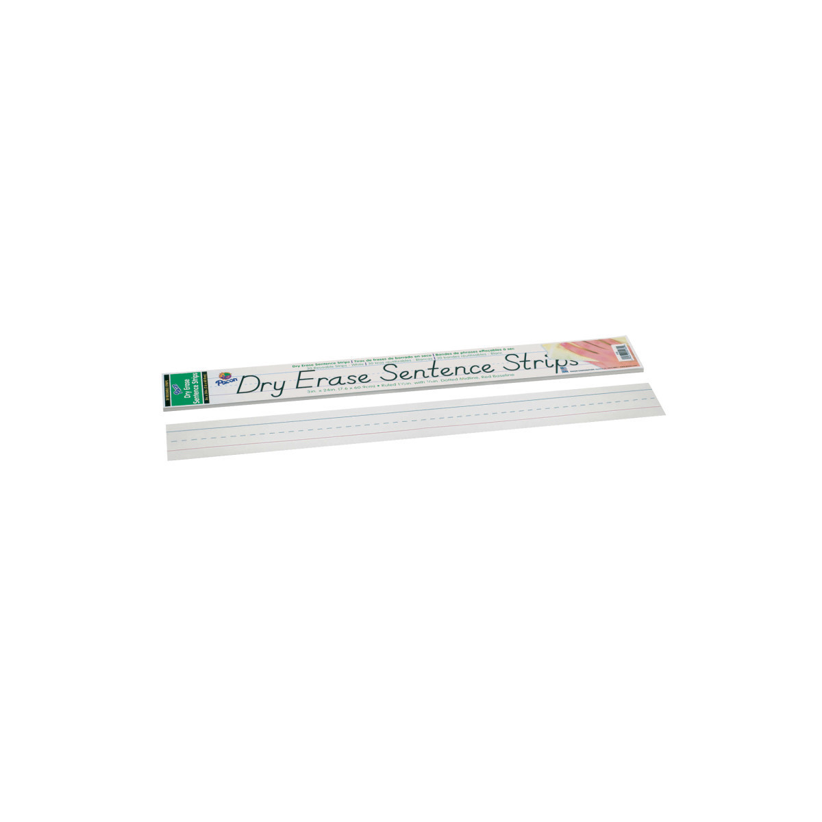 The dry erase surface makes these sentence strips convenient and reusable. Use them again and again in the classroom or at home. Ruled 1-1/2" with red baseline and 3/4" dotted midline on dry erase side. Dry erase surface on one side. Measures 3" x 24". Each pack contains 30 strips.