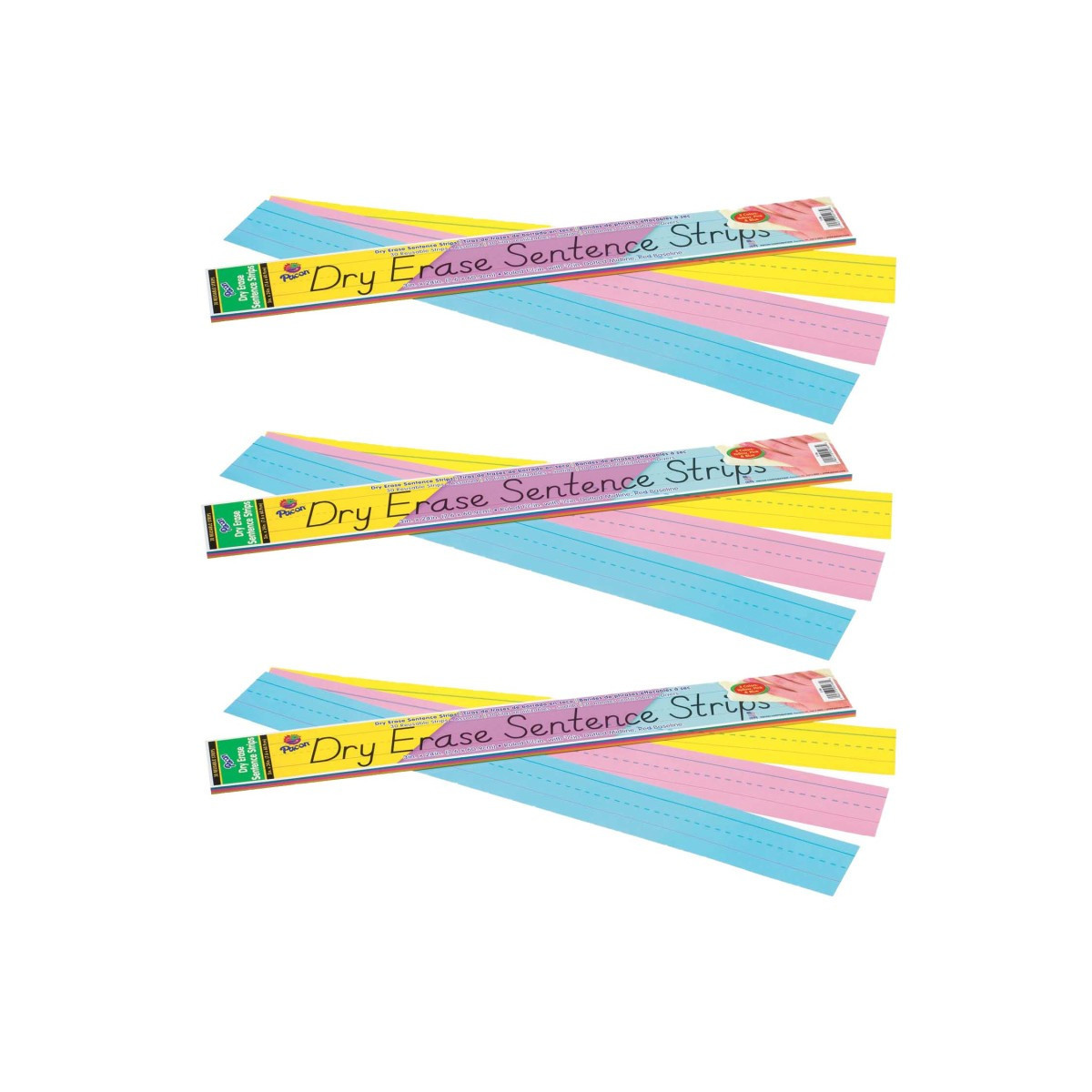 The dry erase surface makes these sentence strips convenient and reusable. Use them again and again in the classroom or at home. Ruled 1-1/2" with red baseline and 3/4" dotted midline on dry erase side. Dry erase surface on one side. Measures 3" x 24". Each pack contains 30 strips in three assorted colors - Blue, Pink and Yellow. Sold as 3 packs for a total of 90 sentence strips.