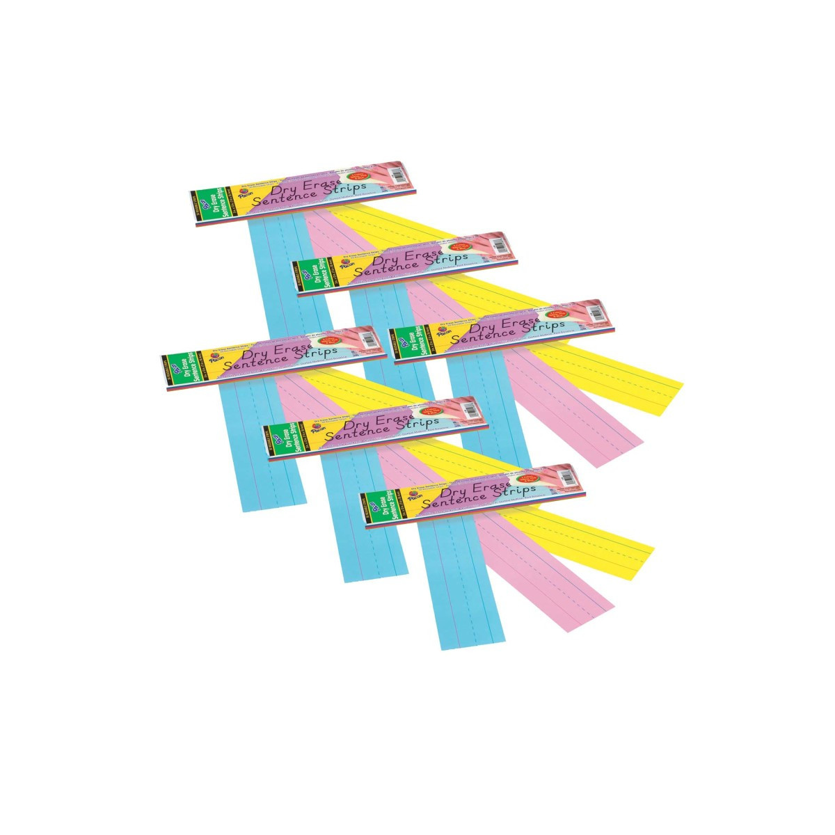 The dry-erase surface makes these sentence strips convenient and reusable! Each strip is ruled 1.5" with red baseline and .75" dotted midline. Dry-erase surface is on one side only. Assorted colors include Blue, Pink and Yellow. Each pack includes 30 strips. Measures 3" x 12". Sold as 6 packs for a total of 180 strips.