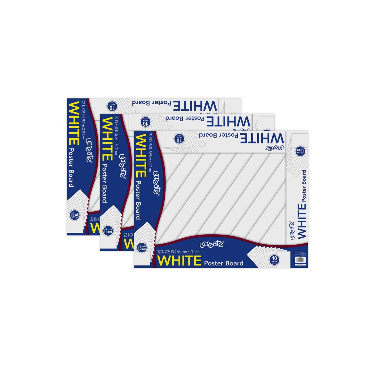 Convenient White packaged poster board is ideal for posters, signs, displays, and art projects. White (C1S) finish is coated on one side only. Recyclable. Each sheet measures 22" x 28". Each pack includes 10 white sheets. Sold as 3 packs for a total of 30 sheets.