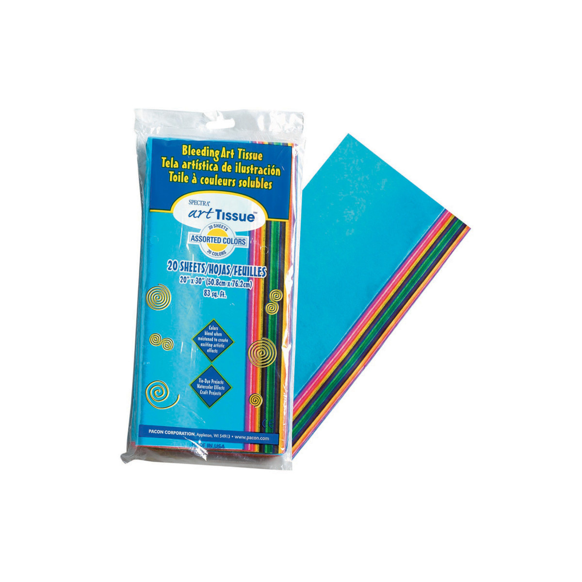 Spectra® Deluxe Bleeding Art Tissue™ is a fine-quality deluxe-grade tissue that bleeds, making it easy to create arts and crafts projects with a beautiful watercolor look. Rich, vibrant colors blend when moistened to create exciting artistic effects. Wet with a brush and wash beautiful, translucent color on to the paper. Overlap two colors and watch them blend. Or, add glue to the water to hold specific shapes in place and create magnificent, multi-layered effects. The high-quality tissue can withstand cutting, crinkling and folding without tearing. This 20 color assortment includes: Azure, White, Black, Seal Brown, Emerald Green, Apple Green, Spring Green, Canary Yellow, Sky Blue, Orange, Goldenrod, Baby Pink, National Red, Scarlet, Blush Pink, Cerise, Purple, National Blue, Medium Blue and French Blue. Sheets measures 20" x 30". Folded package size is 6" x 12". Includes 20 sheets.