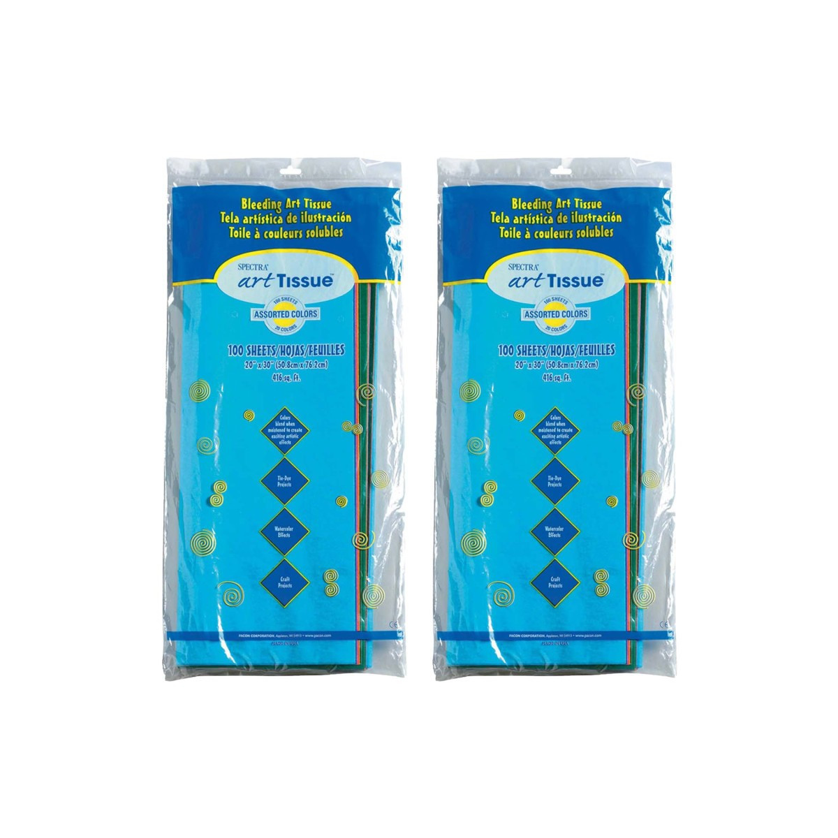 Spectra® Deluxe Bleeding Art Tissue™ is a fine-quality deluxe-grade tissue that bleeds, making it easy to create arts and crafts projects with a beautiful watercolor look. Rich, vibrant colors blend when moistened to create exciting artistic effects. Wet with a brush and wash beautiful, translucent color on to the paper. Overlap two colors and watch them blend. Or, add glue to the water to hold specific shapes in place and create magnificent, multi-layered effects. The high-quality tissue can withstand cutting, crinkling and folding without tearing. This 20 color assortment includes: Azure, White, Black, Seal Brown, Emerald Green, Apple Green, Spring Green, Canary Yellow, Sky Blue, Goldenrod, Orange, Baby Pink, National Red, Scarlet, Blush Pink, Cerise, Purple, National Blue, Medium Blue and French Blue. Sheets measure 20" x 30". Each pack includes 100 sheets. Sold as 2 packs for a total of 200 sheets.