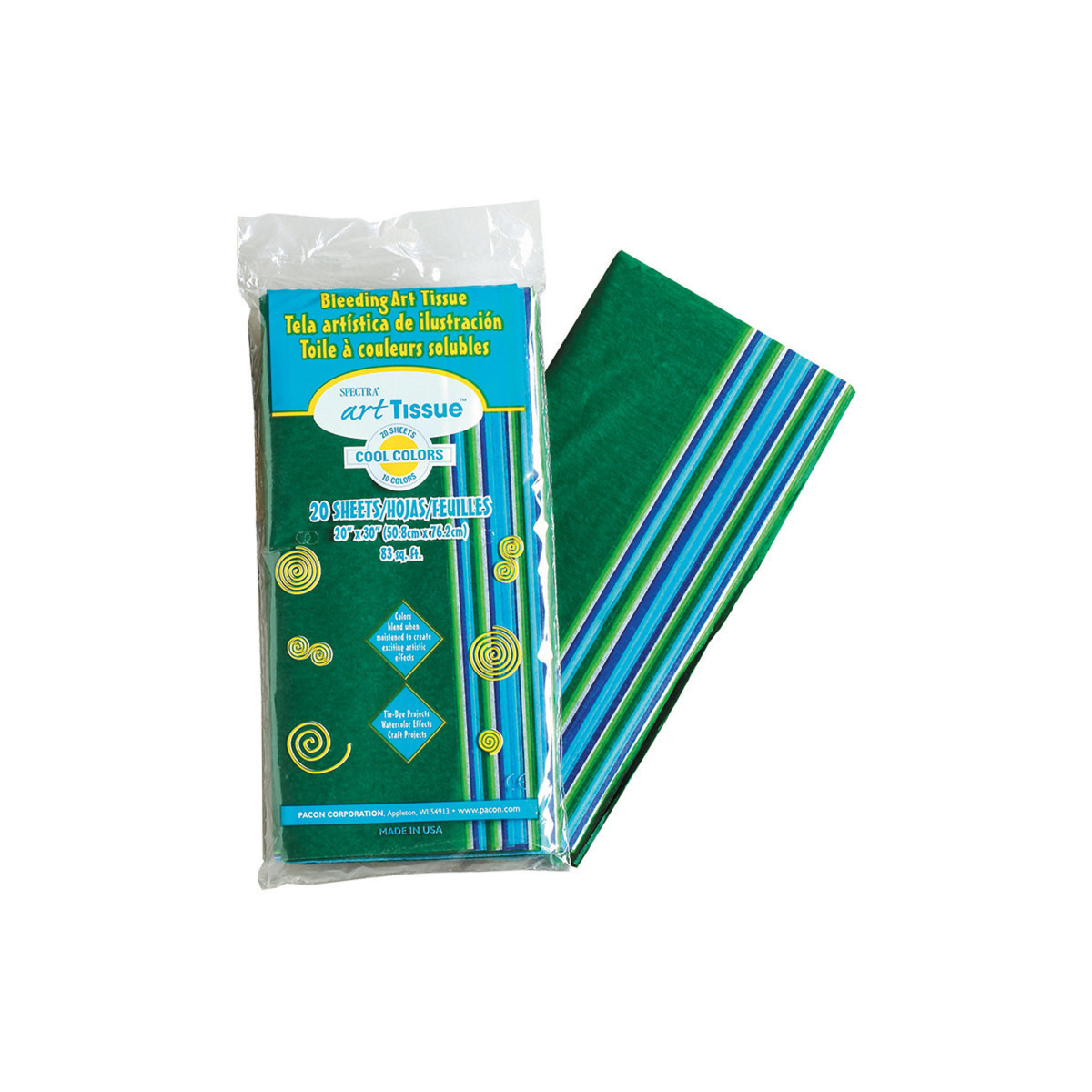 Spectra® Deluxe Bleeding Art Tissue™ is a fine-quality deluxe-grade tissue that bleeds, making it easy to create arts and crafts projects with a beautiful watercolor look. Rich, vibrant colors blend when moistened to create exciting artistic effects. Wet with a brush and wash beautiful, translucent color on to the paper. Overlap two colors and watch them blend. Or, add glue to the water to hold specific shapes in place and create magnificent, multi-layered effects. The high-quality tissue can withstand cutting, crinkling and folding without tearing. This Cool Colors Assortment includes blues and greens. Two sheets each of 10 colors. Folded package is 6" x 12". Sheets measures 20" x 30". Includes 20 sheets.