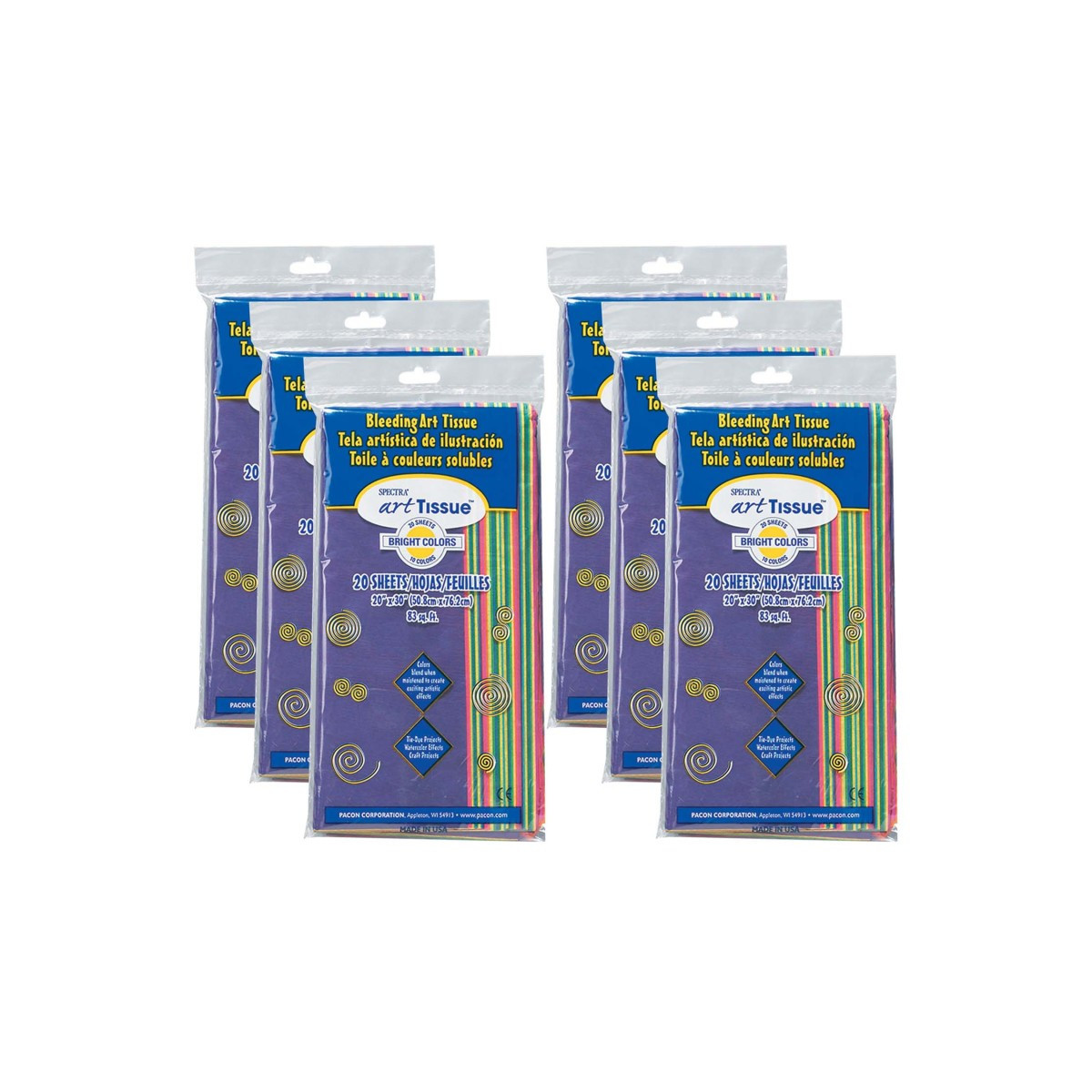 Spectra® Deluxe Bleeding Art Tissue™ is a fine-quality deluxe-grade tissue that bleeds, making it easy to create arts and crafts projects with a beautiful watercolor look. Rich, vibrant colors blend when moistened to create exciting artistic effects. Wet with a brush and wash beautiful, translucent color on to the paper. Overlap two colors and watch them blend. Or, add glue to the water to hold specific shapes in place and create magnificent, multi-layered effects. The high-quality tissue can withstand cutting, crinkling and folding without tearing. Assortment features two sheets each of 10 vivid colors: Cerise, Apple, French Blue, Orange, Yellow, Red, Medium Blue, Cadmium Yellow, Pansy and Leaf Green. Sheets measures 20" x 30". Each pack includes 20 sheets. Sold as 6 packs for a total of 120 sheets.