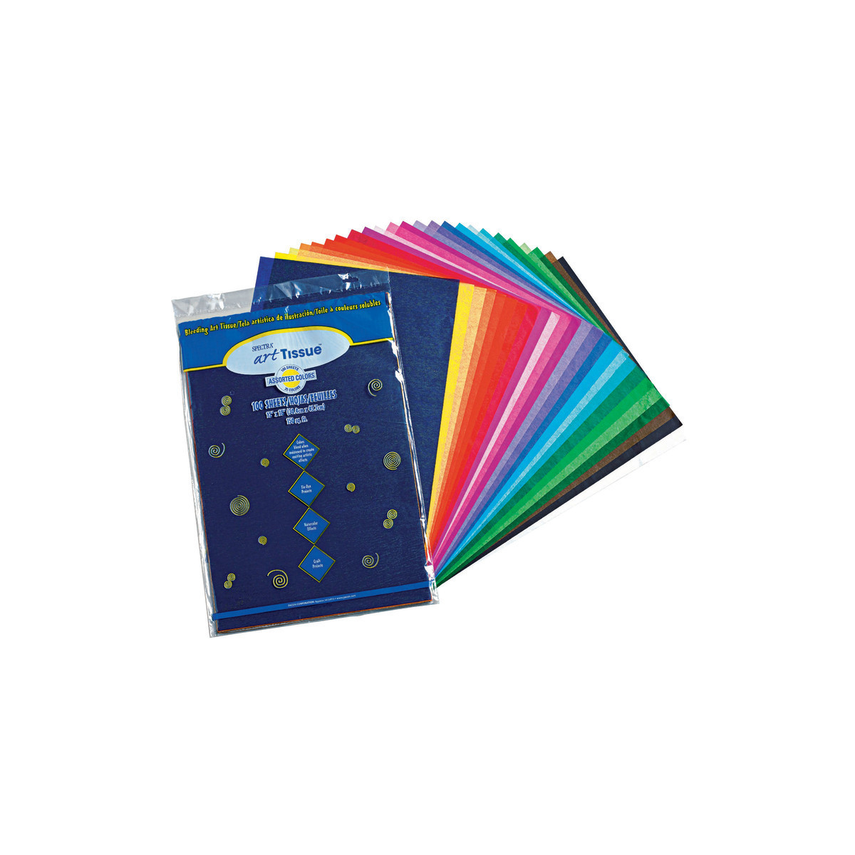 Spectra® Deluxe Bleeding Art Tissue™ is a fine-quality deluxe-grade tissue that bleeds, making it easy to create arts and crafts projects with a beautiful watercolor look. Rich, vibrant colors blend when moistened to create exciting artistic effects. Wet with a brush and wash beautiful, translucent color on to the paper. Overlap two colors and watch them blend. Or, add glue to the water to hold specific shapes in place and create magnificent, multi-layered effects. The high-quality tissue can withstand cutting, crinkling and folding without tearing. This 25 color assortment includes: National Blue, Dark Pink, Canary, Goldenrod, Orange, Chinese, Scarlet, National Red, Cerise, Baby Pink, Blush Pink, Magenta, Orchid, Purple, Medium Blue, French Blue, Sky Blue, Azure Blue, Emerald Green, Apple Green, Spring Green, Leaf Green, Seal Brown, Black and White. Sheets measures 12" x 18". Includes 100 sheets.