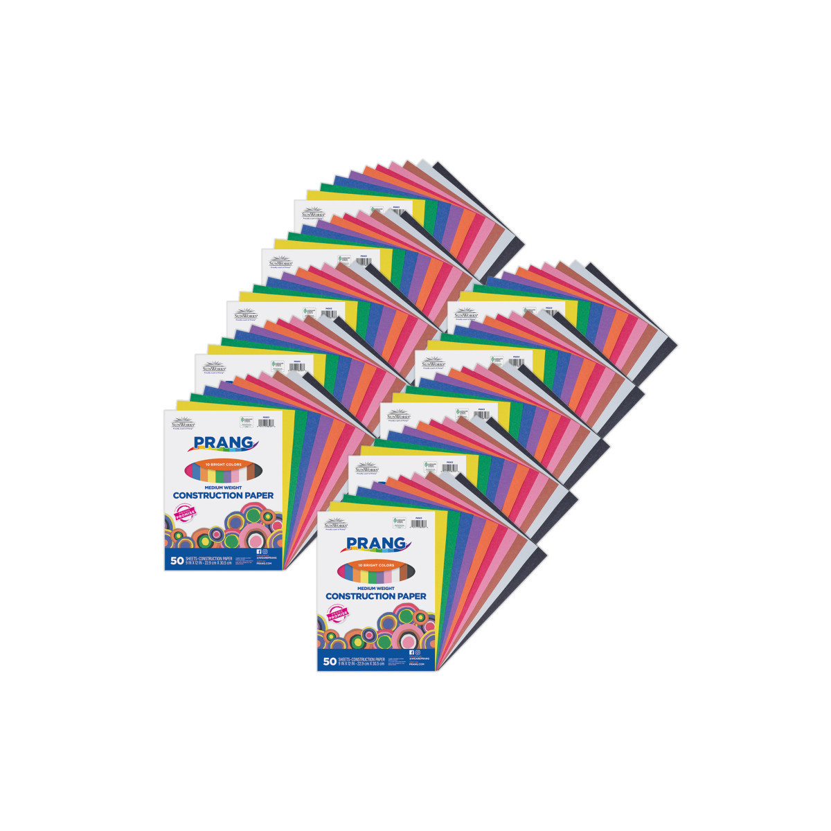 Prang® Medium Weight Groundwood Construction Paper provides the best value in school grade construction paper. It is the perfect solution for school projects and other arts and crafts. It has bright and consistent colors, is slightly textured and cuts and folds evenly without cracking. This 10 color assortment includes Scarlet, Black, Yellow-Orange, Brown, Pink, Violet, Blue, Holiday Green, White, and Yellow. Recyclable. Measures 9" x 12". Each pack includes 50 sheets. Sold as 10 packs for a total of 500 sheets.