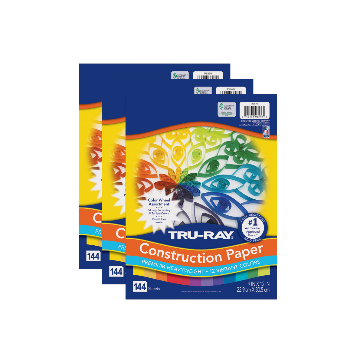 Heavyweight 100% vat-dyed sulphite with longer, stronger fibers. Tru-Ray® Construction Paper is tough enough to take scoring, folding and curling without cracking and tearing. Its superior fade-resistance keeps projects brighter and fresher longer. Color Wheel assortment is ideal for teaching color theory and color mixing and includes: Yellow, Gold, Orange, Festive Red, Holiday Red, Magenta, Violet, Purple, Blue, Turquoise, Holiday Green and Brilliant Lime. Acid free for less fade. Project instructions are printed on the back of the top sheet. Recyclable. Measures 9" x 12". Each pack includes 144 sheets. Sold as 3 packs for a total of 432 sheets.