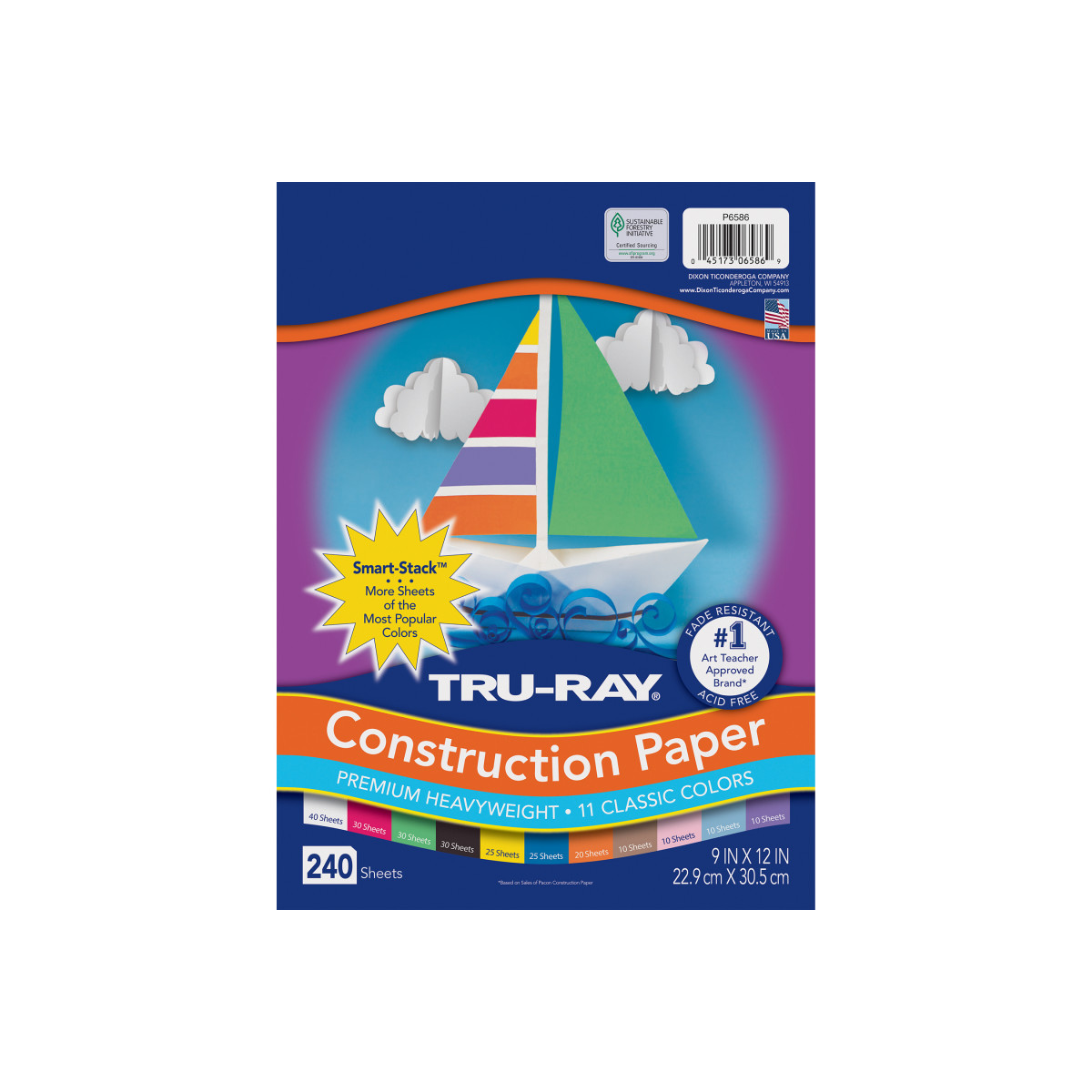 Our popular Tru-Ray® Sulphite Construction Paper available in Smart-Stack™ assortments that include more sheets of the most popular colors. Assortments include: White, Black, Festive Green, Festive Red, Yellow, Orange, Royal Blue, Violet, Pink, Sky Blue and Warm Brown. Acid free for less fade. Recyclable. Measures 9" x 12". Each pack includes 240 sheets.