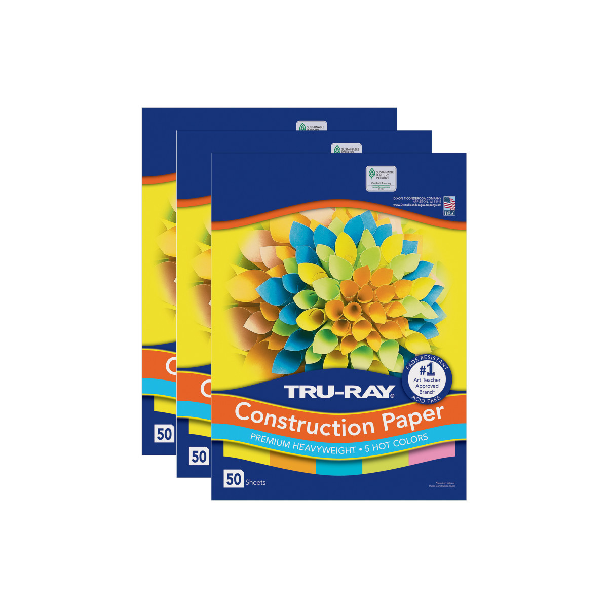 Heavyweight 100% vat-dyed sulphite with longer, stronger fibers. Tru-Ray® Construction Paper is tough enough to take scoring, folding and curling without cracking and tearing. Its superior fade-resistance keeps projects brighter and fresher longer. Colors include: Brilliant Lime, Shocking Pink, Electric Orange, Atomic Blue, and Lively Lemon. Acid free for less fade. 50% recycled fiber content and recyclable. Measures 12" x 18". Each pack includes 50 sheets. Sold as 3 packs for a total of 150 sheets.
