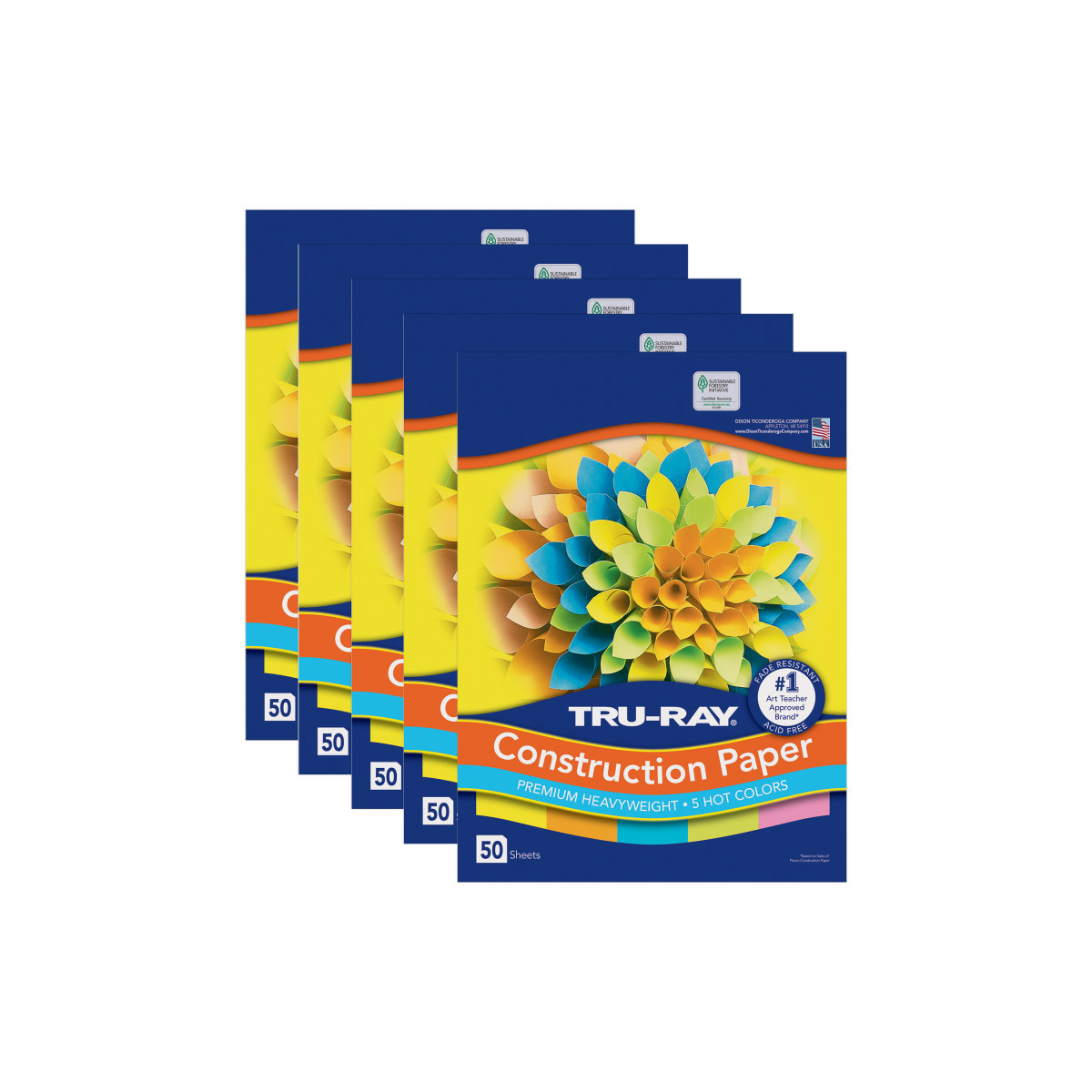Heavyweight 100% vat-dyed sulphite with longer, stronger fibers. Tru-Ray® Construction Paper is tough enough to take scoring, folding and curling without cracking and tearing. Its superior fade-resistance keeps projects brighter and fresher longer. Colors include: Brilliant Lime, Shocking Pink, Electric Orange, Atomic Blue, and Lively Lemon. Acid free for less fade. 50% recycled fiber content and recyclable. Measures 12" x 18". Each pack includes 50 sheets. Sold as 5 packs for a total of 250 sheets.