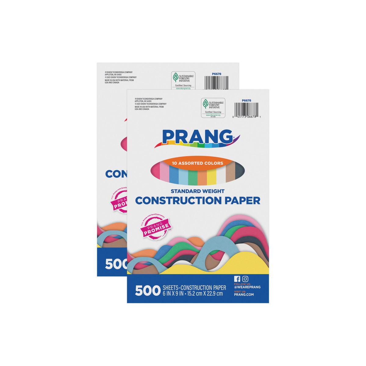 Prang® 10 color assortment is perfect for beginner arts and crafts, and ideal for young children. Colors include: White, Sky Blue, Blue, Pink, Scarlet, Orange, Brown, Yellow, Green, and Black. Works great for cutting, pasting, doodling and folding. Recyclable. Measures 6" x 9". Each pack includes 500 sheets. Sold as 2 packs for a total of 1000 sheets.