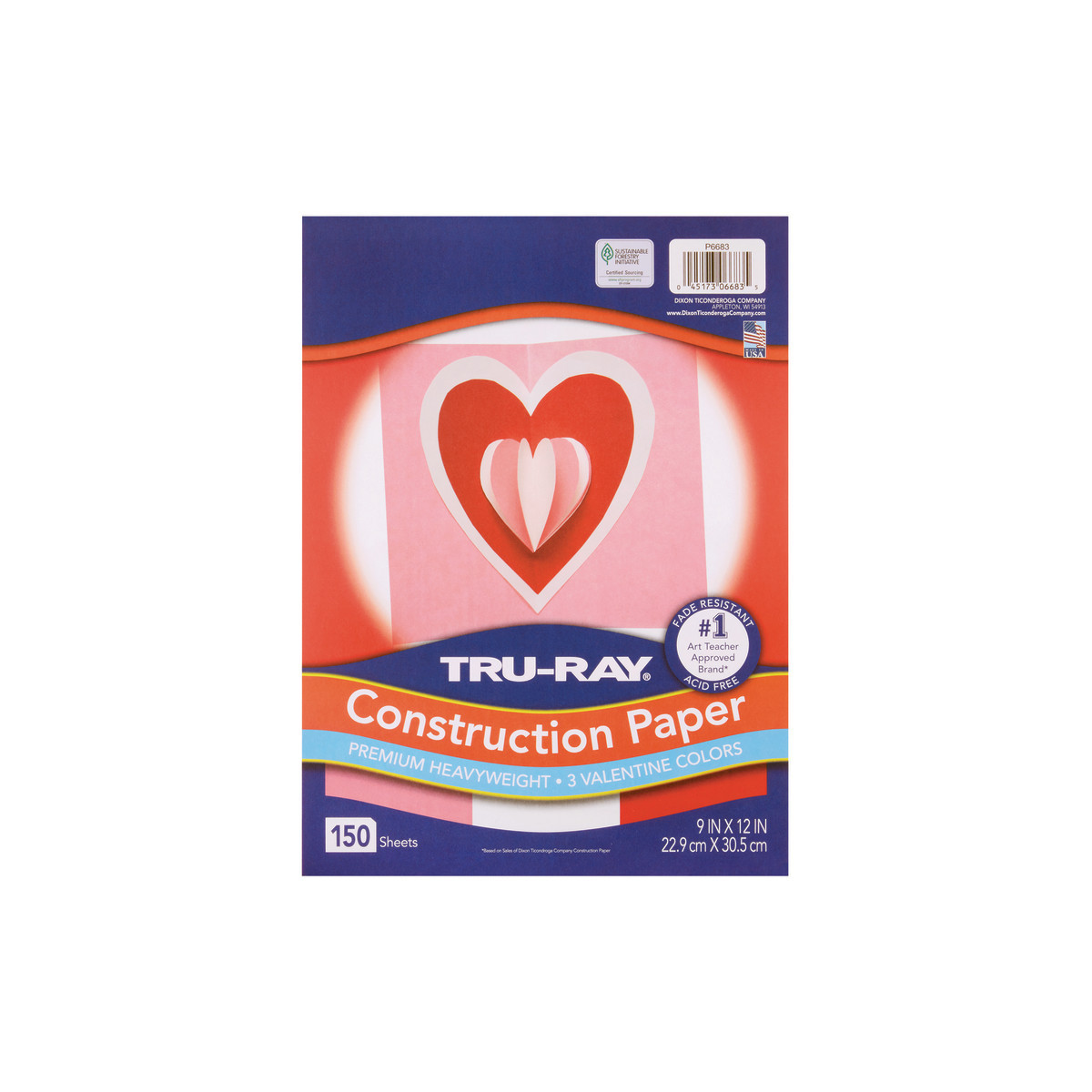 Heavyweight 100% vat-dyed sulphite with longer, stronger fibers. Tru-Ray® Construction Paper is tough enough to take scoring, folding and curling without cracking and tearing. Its superior fade-resistance keeps projects brighter and fresher longer. Valentine Assortment includes: Festive Red, White, and Shocking Pink. Nice size assortment for classrooms, camps, and parties. Acid free for less fade. 50% recycled fiber content and recyclable. Measures 9" x 12". Each pack includes 150 sheets.