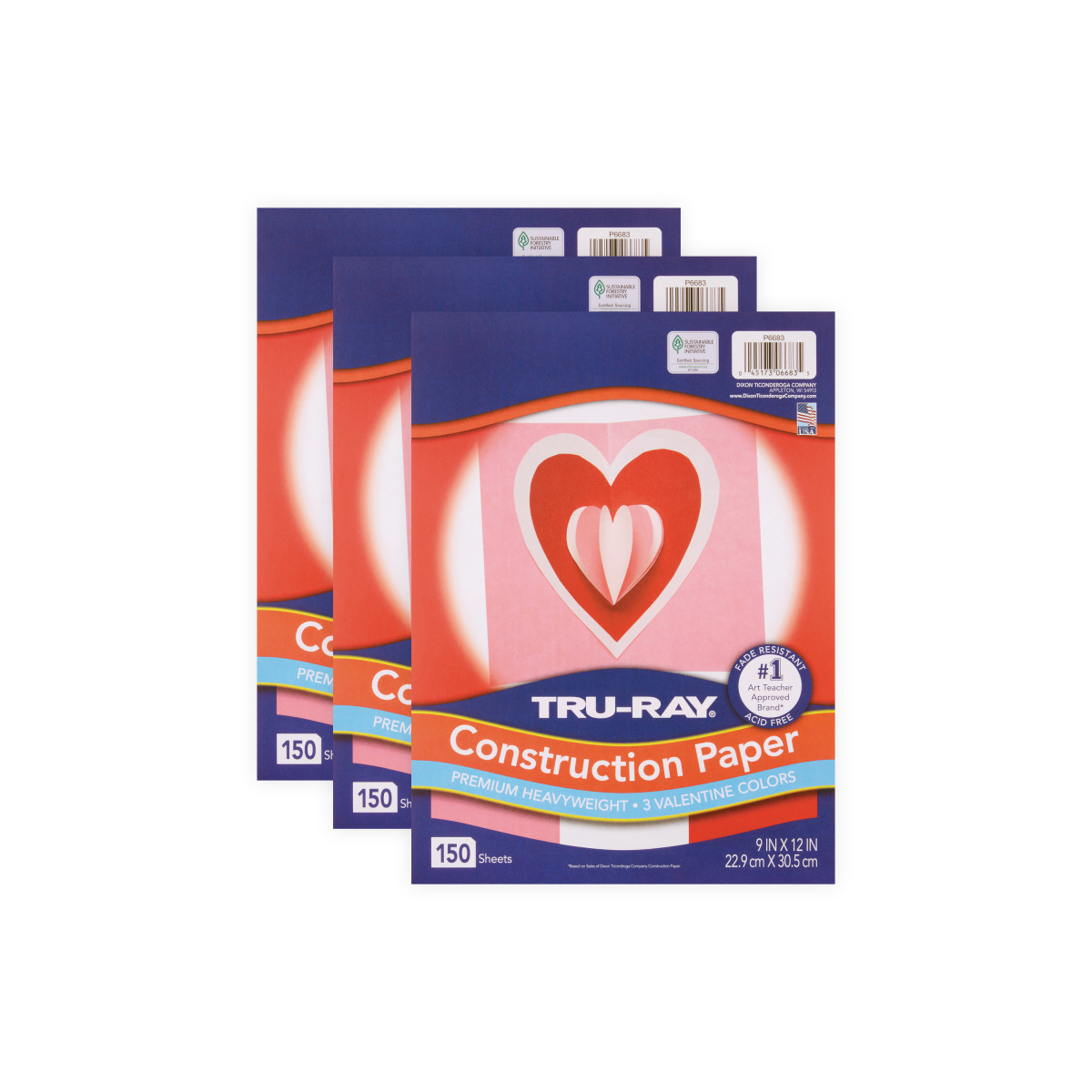 Heavyweight 100% vat-dyed sulphite with longer, stronger fibers. Tru-Ray® Construction Paper is tough enough to take scoring, folding and curling without cracking and tearing. Its superior fade-resistance keeps projects brighter and fresher longer. Valentine Assortment includes: Festive Red, White, and Shocking Pink. Nice size assortment for classrooms, camps, and parties. Acid free for less fade. 50% recycled fiber content and recyclable. Measures 9" x 12". Each pack includes 150 sheets. Sold as 3 packs for a total of 450 sheets.