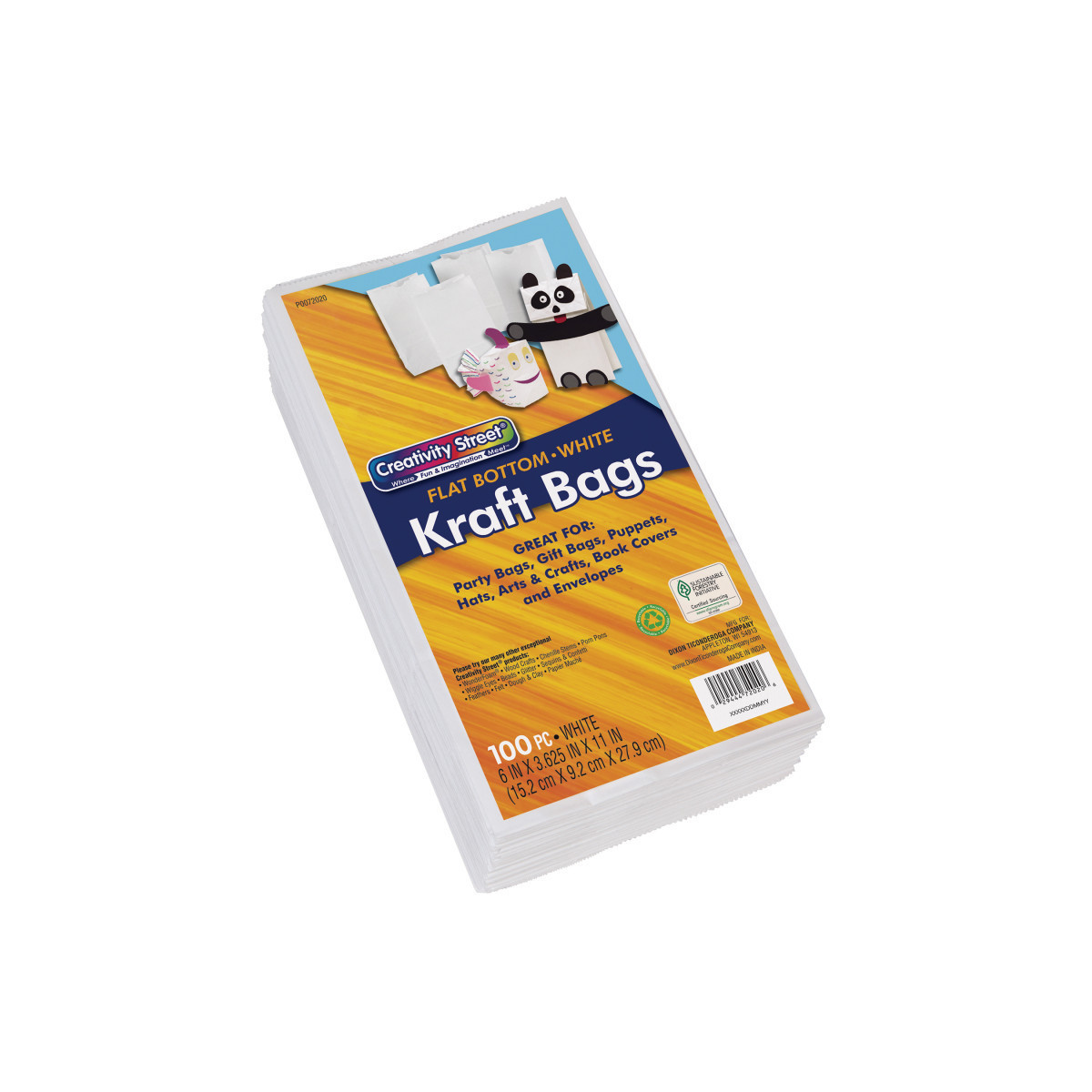 Perfect for many craft projects like making puppets, masks, luminaries, hats and gift bags! Kraft Bags are made from high quality uncoated kraft paper that accepts all types of media like crayons, pens, paints and rubber stamps. These #6 flat bottom bags measure 6" x 3-5/8" x 11" and are recyclable. Includes 100 bags.