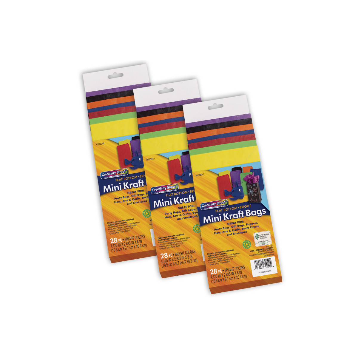 Perfect for many arts and crafts projects like making puppets, masks, party bags, hats and gift bags. Our bags are made from high quality, brightly colored uncoated kraft paper that accepts all types of media like crayons, pens, paints and rubber stamps. Recyclable. Measures 4" x 2-5/8" x 11". Each pack includes 28 bags in assorted bright colors. Sold as 3 packs for a total of 84 bags.