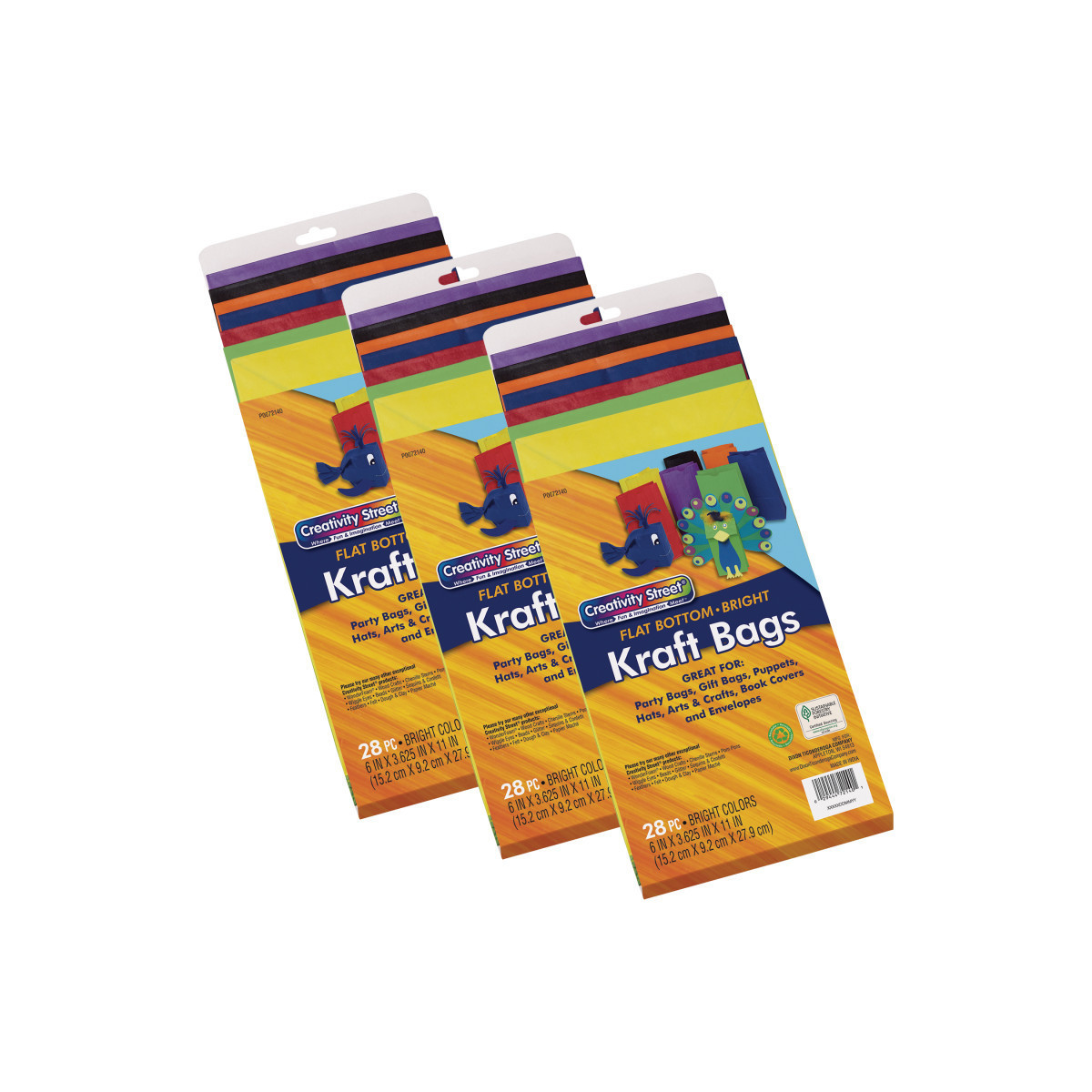 Perfect for many arts and crafts projects like making puppets, masks, party bags, hats and gift bags. Our bags are made from high-quality, brightly-colored uncoated kraft paper that accepts all types of media like crayons, pens, paints and rubber stamps. These #6 Flat Bottom Bags come in Assorted Bright colors. Colorful packaging includes fun project ideas. Recyclable. Measures 6" x 3-5/8" x 11". Includes 28 bags. Sold as 3 packs for a total of 84 bags.