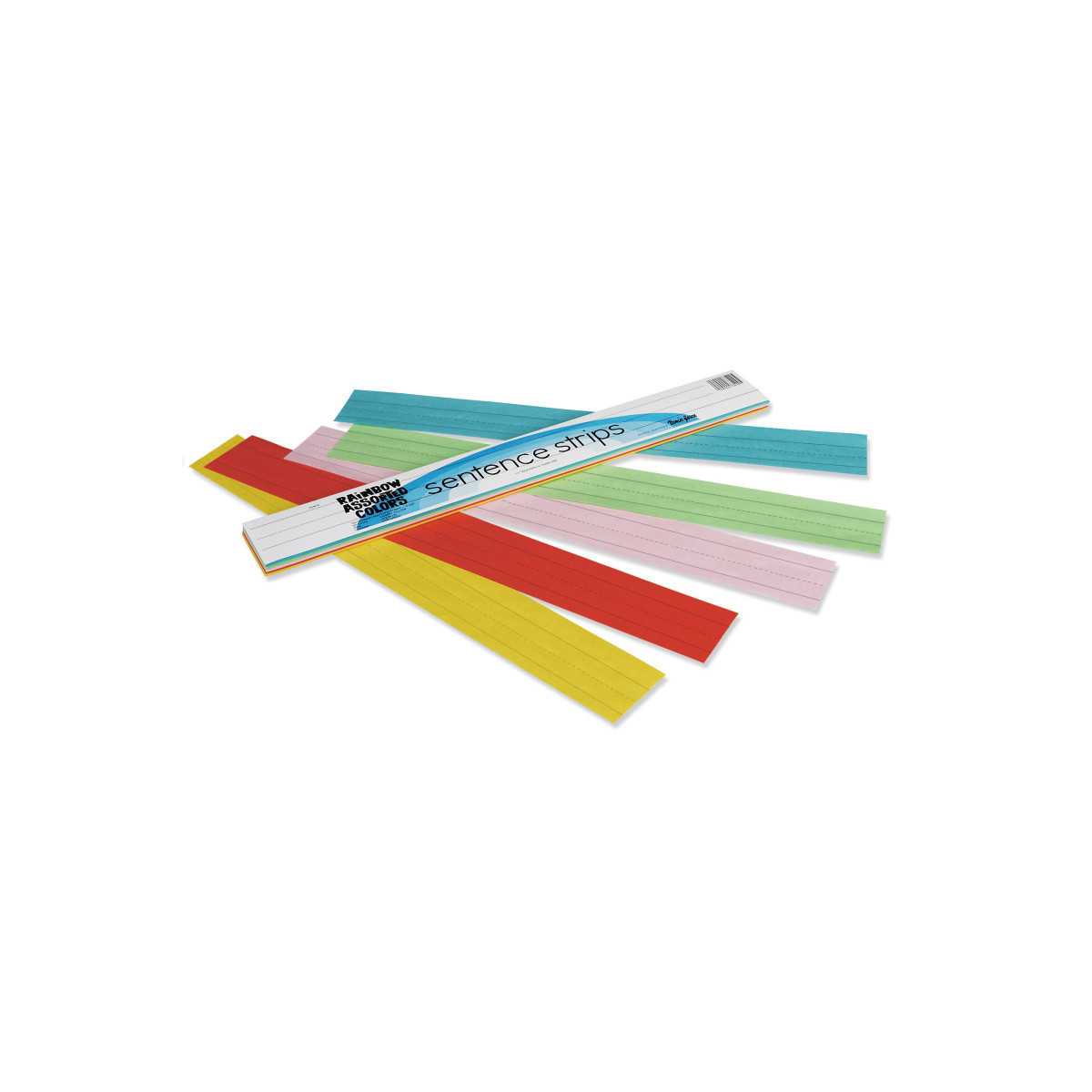 Rainbow® Kraft Sentence Strips are 3" x 24" with a 1.5" ruling and 3/4" dotted midline on one side, and a single line ruled on the opposite side. There are 100 strips per-film wrapped package. Assorted colors include Aqua, Lite Green, Pink, Orange and Yellow. These strips are great for use in pocket charts, as well as a visual learning tool for language arts lessons and activities, word walls, math equations and more.