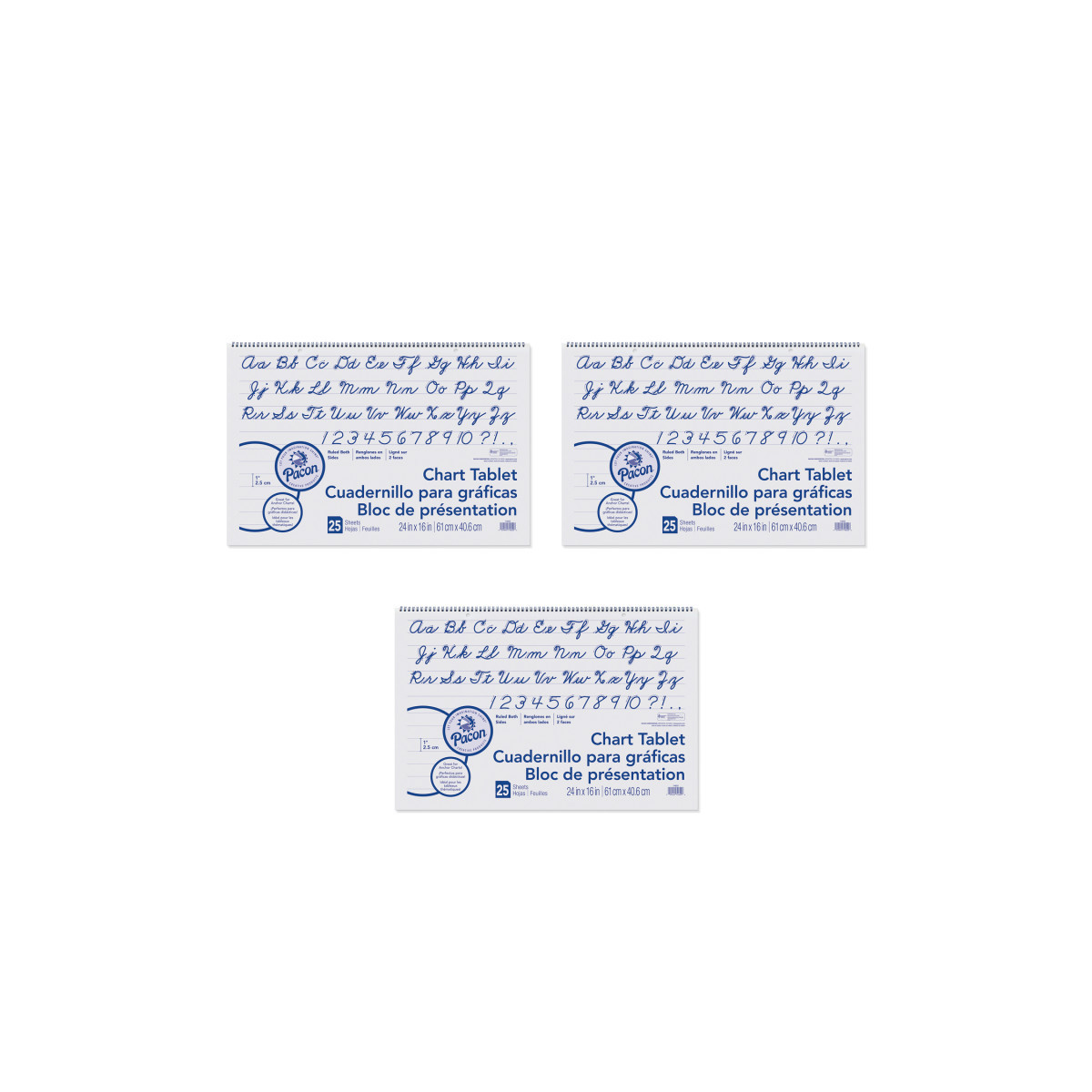 This Chart Tablet features White sulphite bond paper that is spiral bound to stiff covers with a Cursive alphabet printed inside. It is 2-hole punched for easy hanging. Paper is 1" ruled on both sides, and works well for classroom anchor charts, posters and other teaching aids. Measures 24" x 16". Each tablet includes 25 sheets. Sold as a pack of 3 tablets.