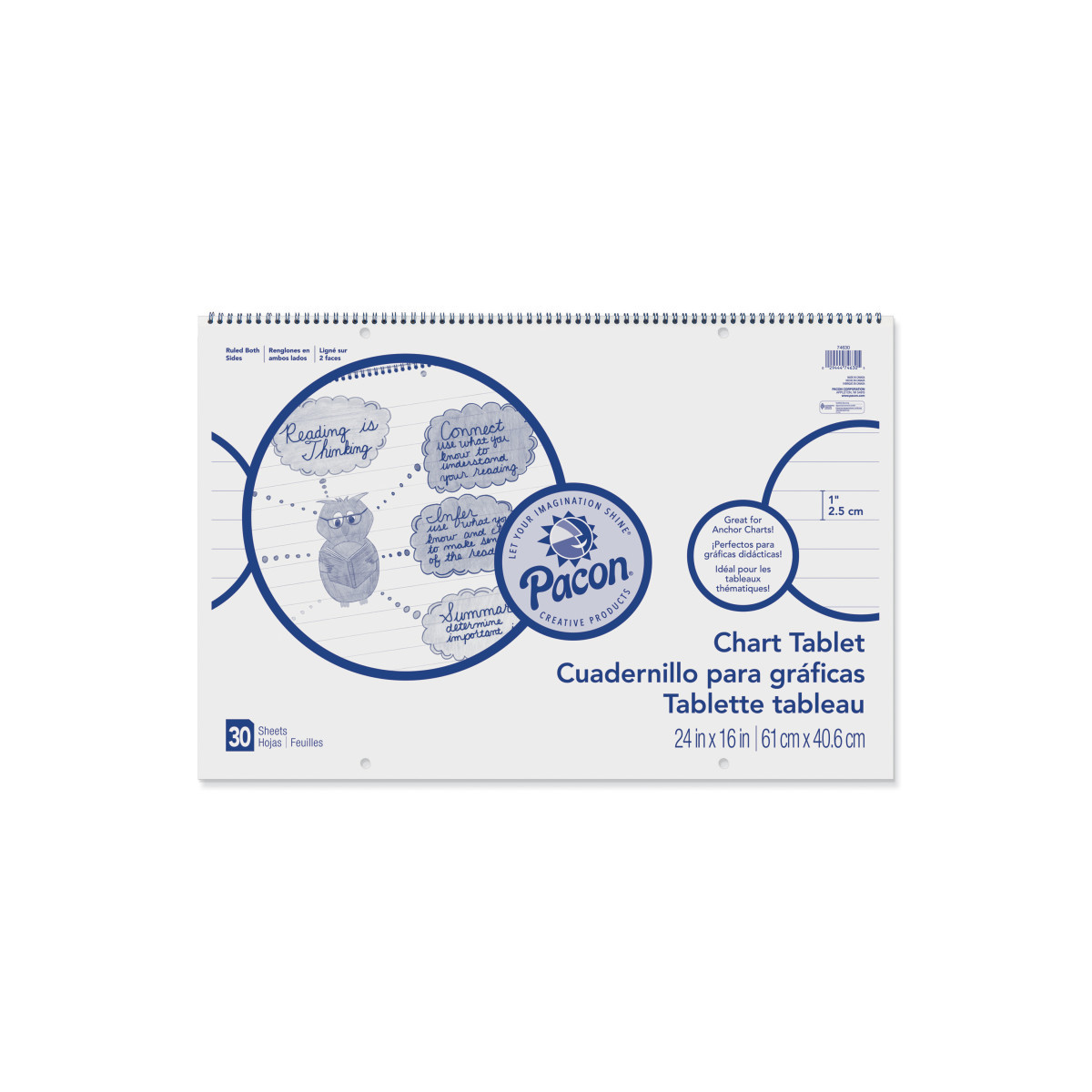 This Chart Tablet features White sulphite bond paper that is spiral bound to stiff covers with a Cursive alphabet printed inside. It is 2-hole punched for easy hanging. Paper is 1" ruled on both sides, and works well for classroom anchor charts, posters and other teaching aids. Measures 24" x 16". Each tablet includes 30 sheets.