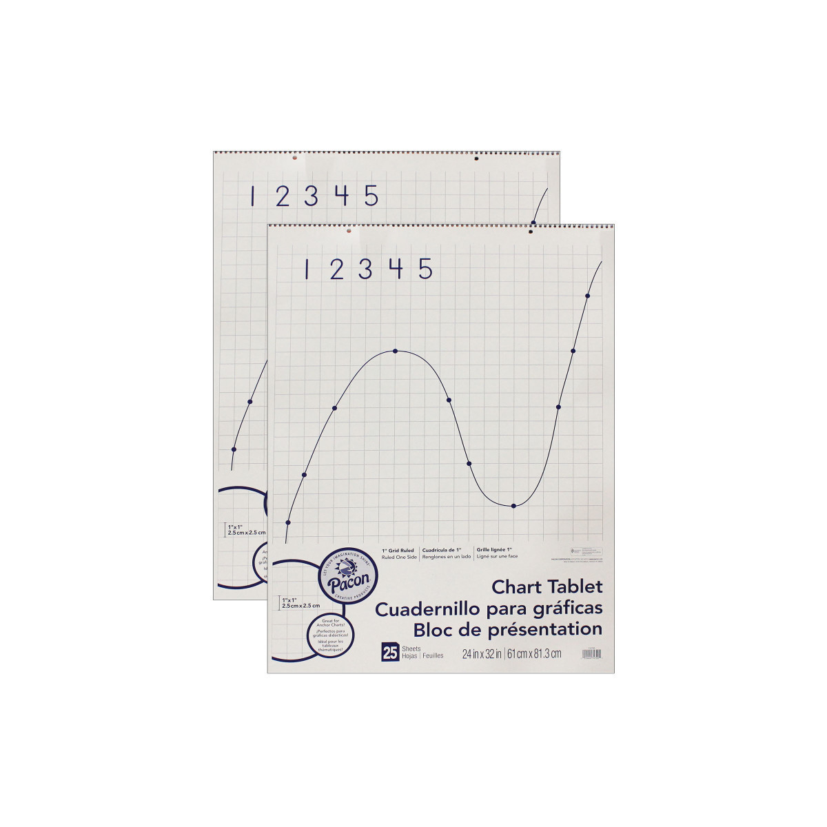 This Chart Tablet features White sulphite bond paper that is spiral bound to stiff covers. It is 2-hole punched on top for easy hanging. Ruled on one side with 1" squares. Perfect for charting plot points, making tables, structure math projects and much more. Works great for classroom anchor charts. Measures 24" x 32". Each chart tablet includes 25 sheets. Sold as a pack of 2 charts.