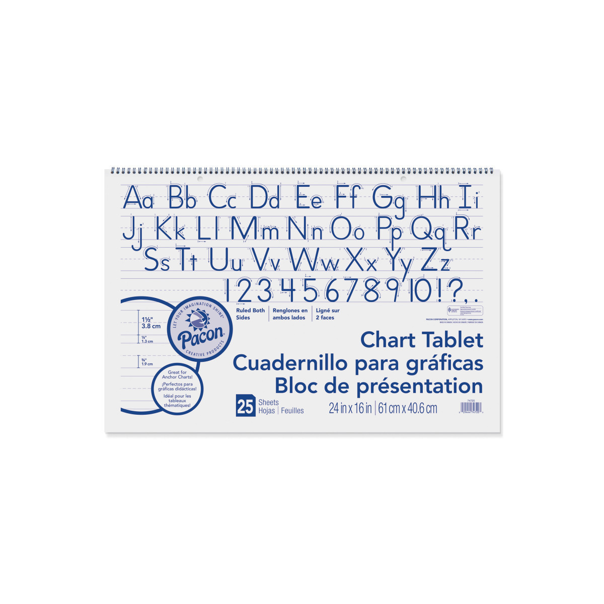 This Chart Tablet features White sulphite bond paper that is spiral bound to stiff covers with a Manuscript alphabet printed inside. It is 2-hole punched for easy hanging. Paper is ruled on both sides, and works well for classroom anchor charts, posters and other teaching aids. Ruling is 1-1/2" with 3/4" broken midline and 1/2" skip space. Measures 24" x 16". Includes 25 sheets.